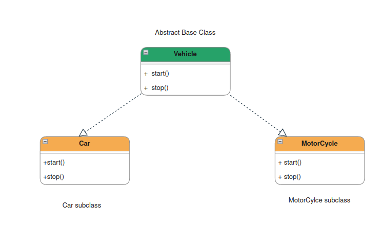 In the above illustration we have a Vehicle ABC that defines two abstract methods start and stop and then we have two subclasses Car and MotorCycle that inherit from the ABC and implement the start and stop methods.