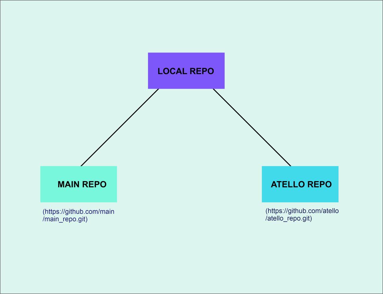 The diagram above shows two remote connections from my repo into the main repo and another developer’s repo. The remote names for these connections are main and Atello. Instead of referencing the full URLs of these remote repositories in other Git commands, you can use the remote names origin and Atello.