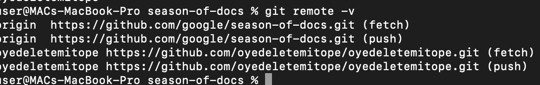 The output shows the remote names associated with season-of_docs repository which are oyedeletemitope and origin are remote names associated with this repository.