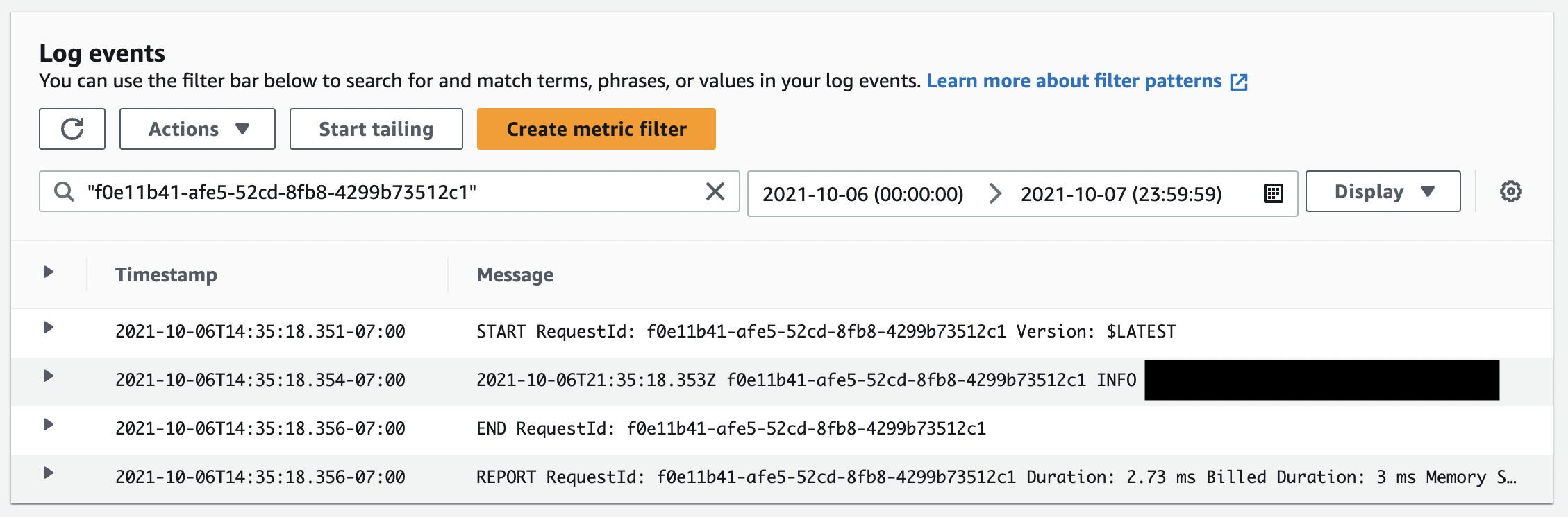- Searching and filtering: Within a log group, you can filter and search for specific logs. From the console, you can enter simple text-based searches or filter expressions using CloudWatch Logs filter syntax. For example, you could filter on the request ID if you’re tracking logs for a specific request. The filtered logs are displayed in the console, and you can further refine the search criteria if you want.