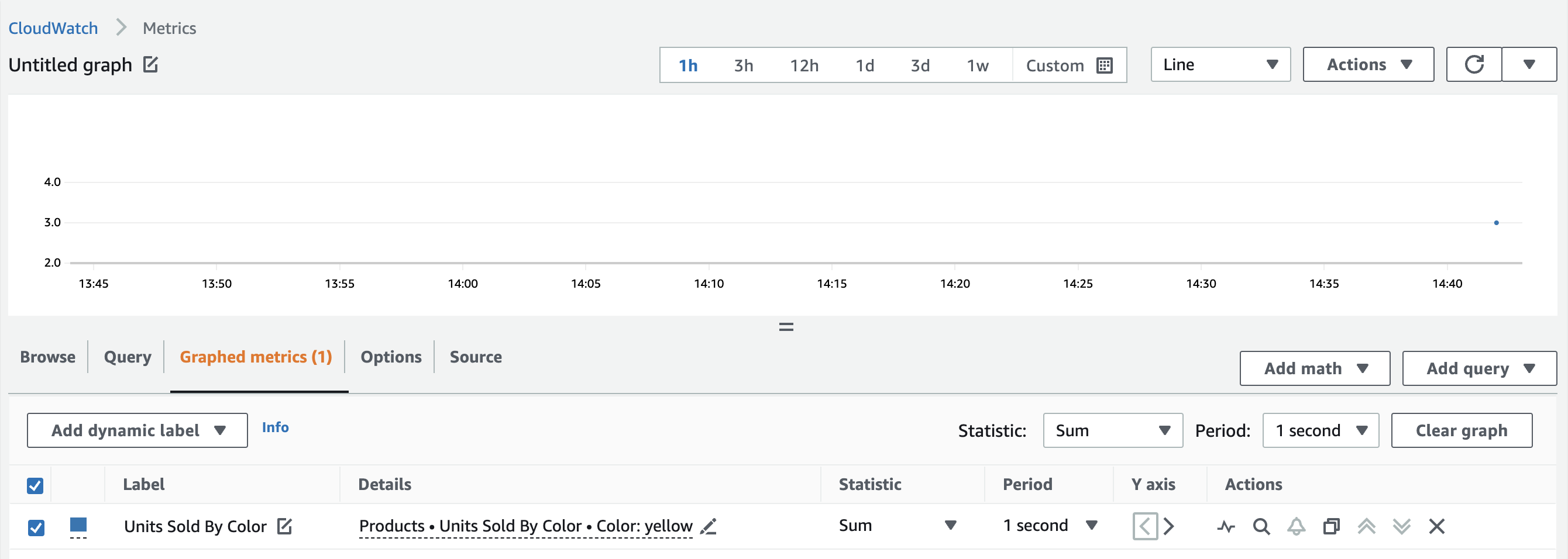 }You should see the metric show up in CloudWatch, under the custom Products namespace: