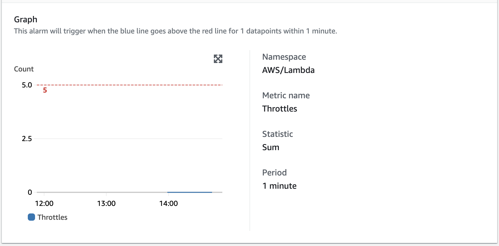 Once you’ve set up metrics for your application, the next step is to set up CloudWatch alarms. Alarms allow you to automate actions based on custom thresholds and conditions. For instance, from the CloudWatch console, you can set up an alarm that sends a notification via Amazon SNS whenever your Lambda functions throttle more than five times in a minute: