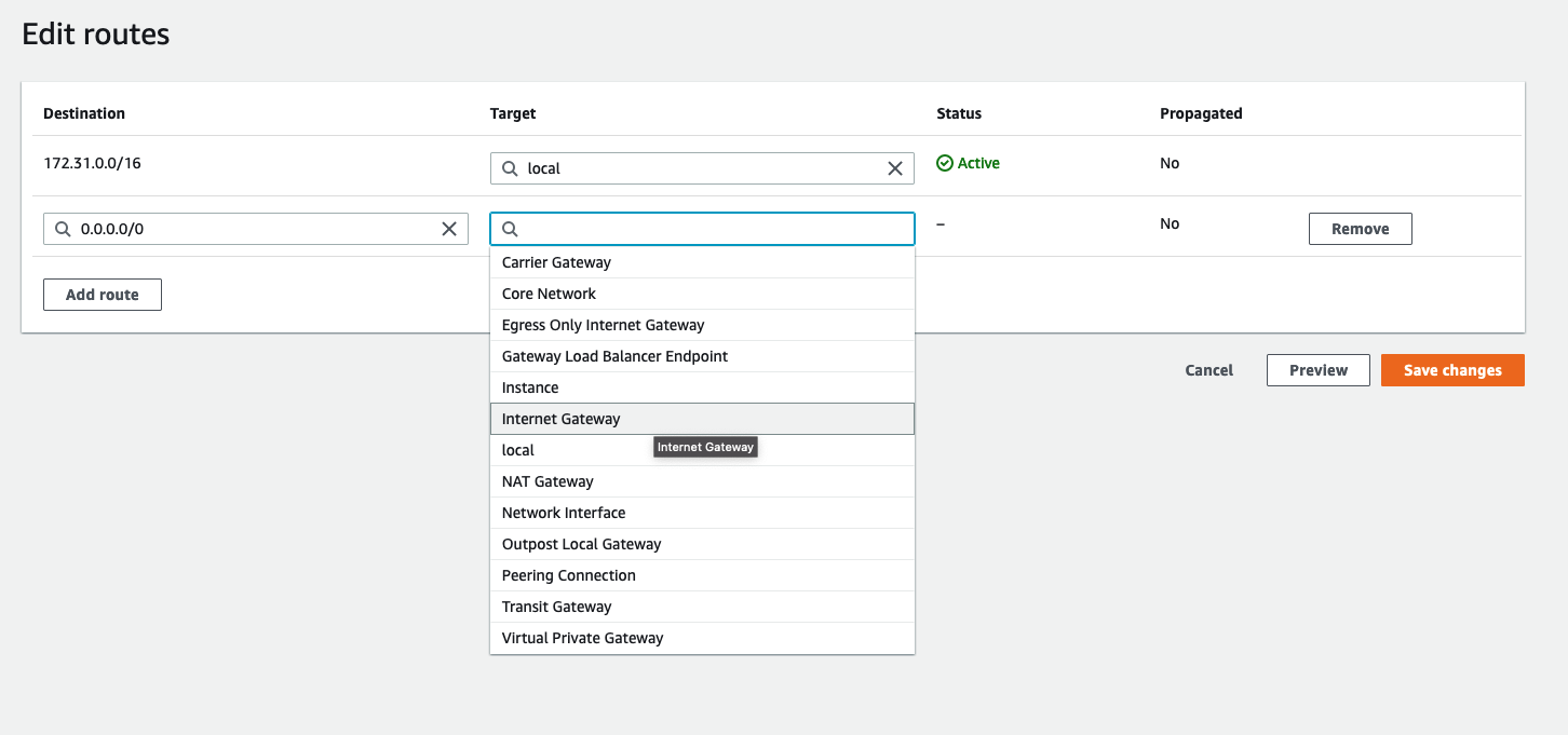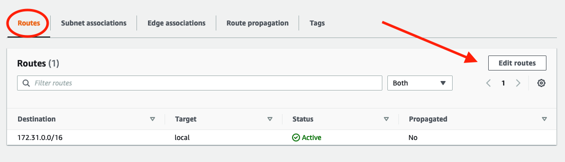 Here you can add new routes to the route table. In our case we want to allow all traffic from our internet gateway to any subnet that is associated with this Route Table. In our case, just the subnet we created earlier.