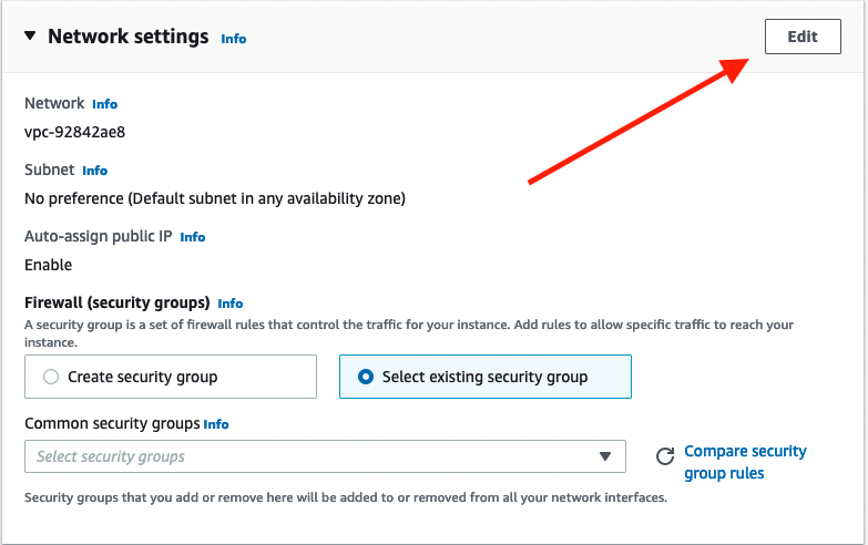 For me, AWS set the VPC for my instance as the default VPC, not the one we created. To change it to the the-greatest-vpc-of-all-time click edit in the upper right corner of the networking section.
