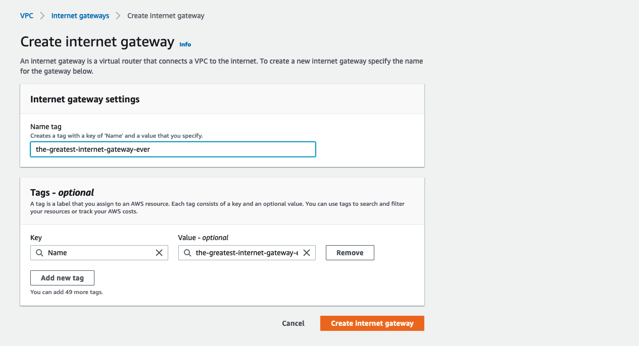 The Internet Gateway is what gives your VPC a tunnel to the internet. Without one, communication is limited to within the VPC. Go to your VPCs dashboard. In the menu on the left, click on Internet Gateways. Then, in the upper right click Create internet gateway. All we need to do here is give our gateway a name.