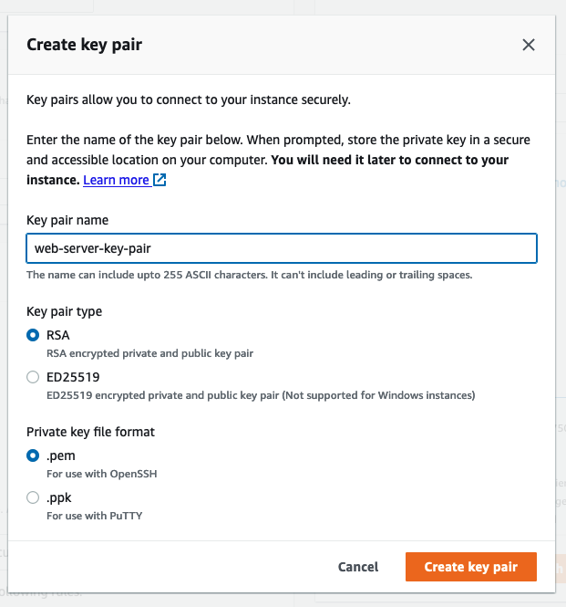 We’ll need to create a key pair so we can ssh into the EC2 instance and install nginx. After you click create pair you’ll automatically download the key. Make note of its location because we will need it later.