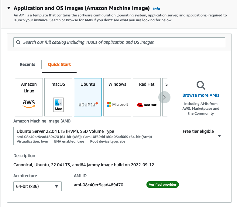 Give your instance a name and then under Application and OS Images you can select an OS to use on your instance. I’ll be using Ubuntu Server 22.04 for this tutorial.