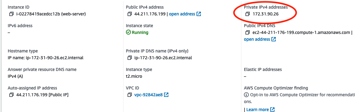 Once the instance is up, you can go to a summary page of the instance and see that it was assigned a private IP address that falls within the range we set up for our subnet.