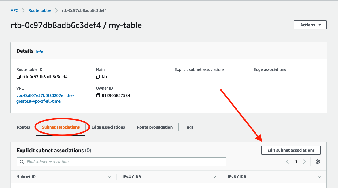 After you create the table, you’ll be taken to Details page it. Here is where we can complete that bridge from VPC to subnet. Select the tab that says Subnet associations. Then click the Edit subnet associations button on the right.