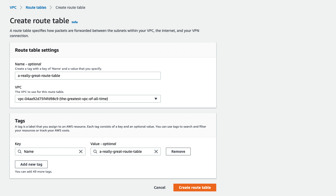 First thing we need to do is name our VPC. Instead of picking something lame like test-vpc-one or my-vpc, let’s call it the-greatest-vpc-of-all-time. It won’t be, but it’s fun to lie.