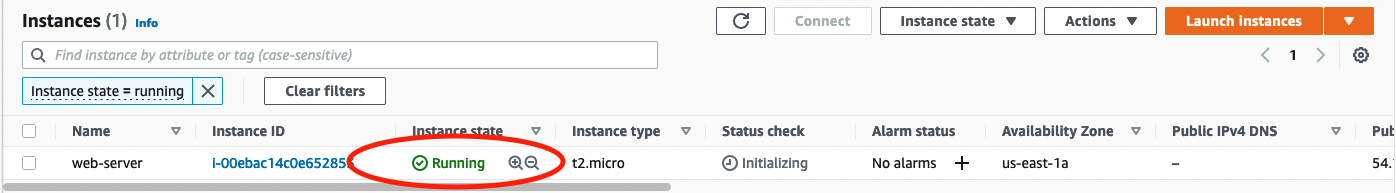 Your instance will take a minute or two to launch. You can check the status by returning to the EC2 Dashboard and clicking on Instances (running).