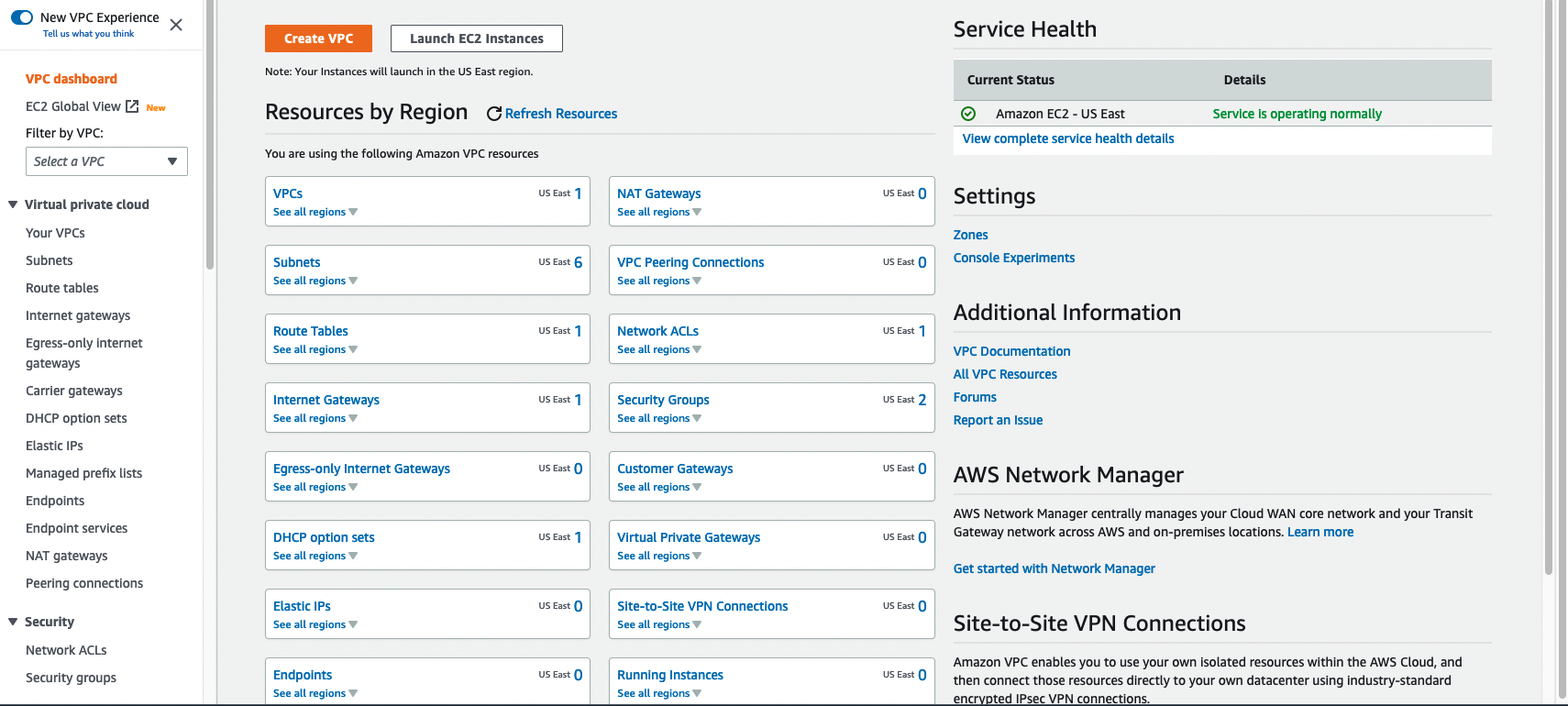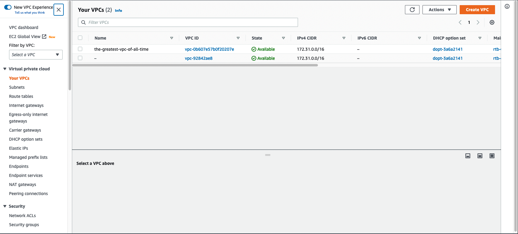 Ok, so a Region is just a part of the world, and an Availability Zone is just sections of that region where the data centers are. That brings us to the VPC. A VPC is your Virtual Private Cloud. It’s basically your own private network on AWS. VPCs exist within regions and span multiple Availability Zones. When you create an account, AWS sets up a VPC for you in every region across the world, which is very nice of them, but for our own learning, let’s create our own.