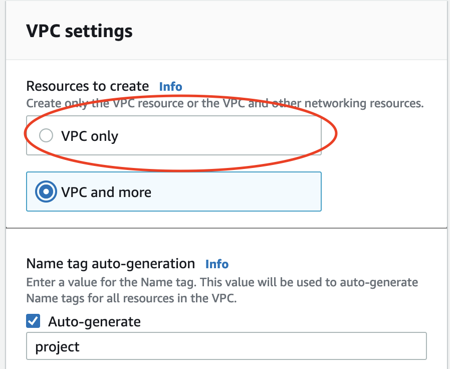 Click the button in the upper left that says Create VPC. There’s an option VPC and more that will walk you through creating your VPC, subnets, routers etc all at once. This is a great tool to get set up quickly, but for learning purposes, we are going to skip out on doing it the easy way and just select VPC only.