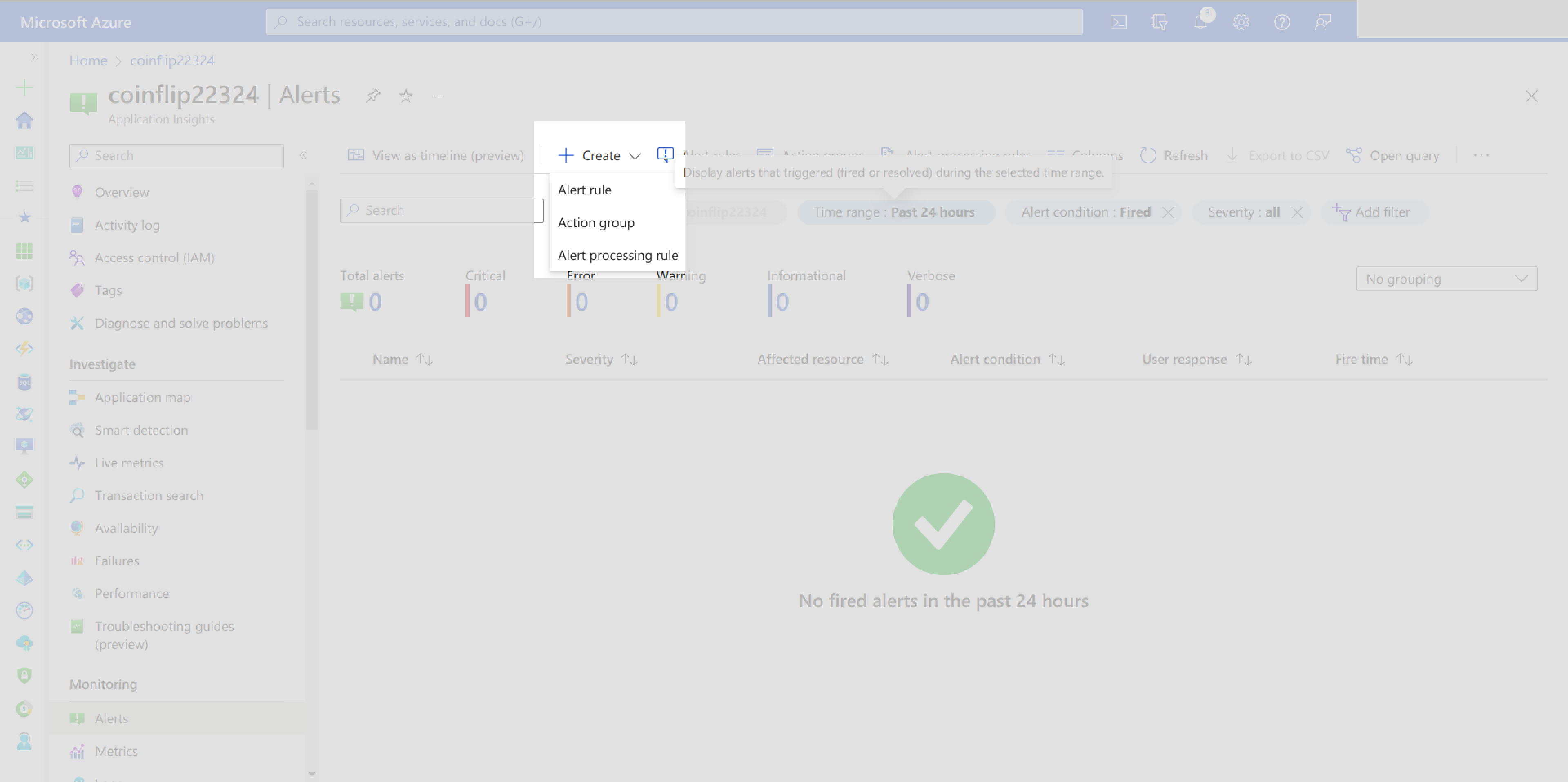 You should not have any alerts set up yet. You can create a new alert by clicking on the Create button and choosing Alert rule:
