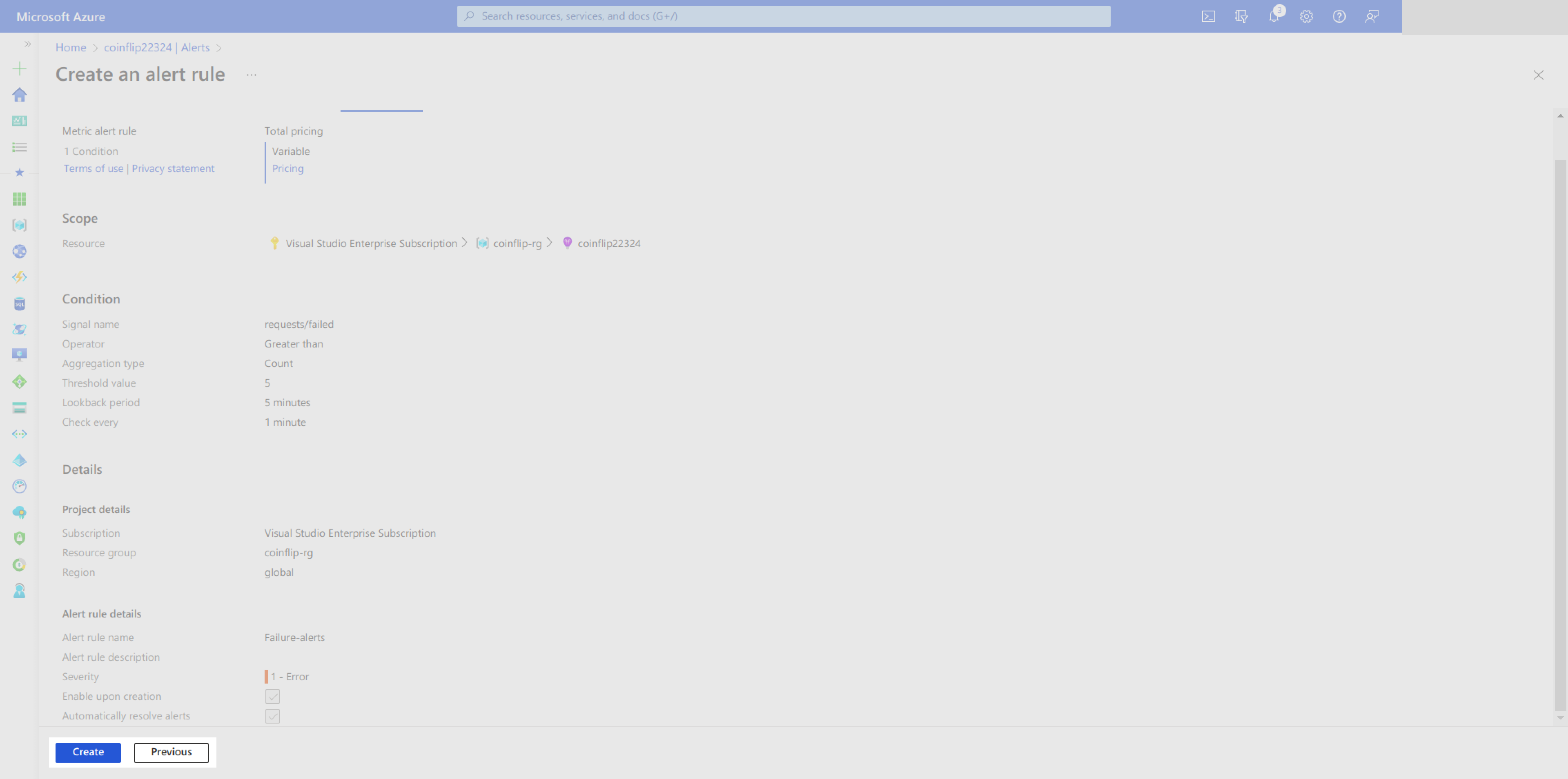 After setting the name and severity, confirm your settings on the Review + Create page and then finalize the alert rule creation by clicking on Create: