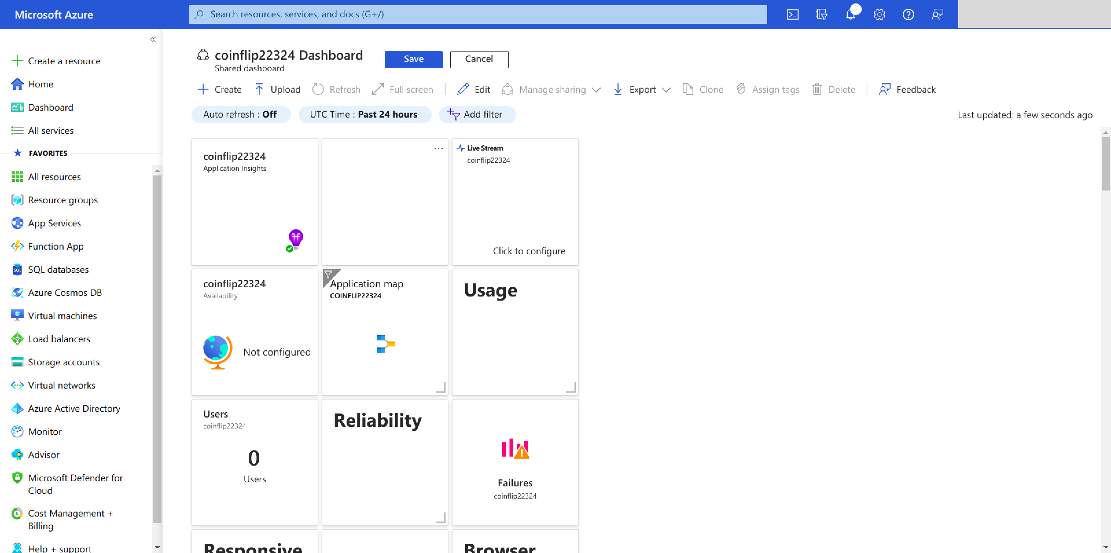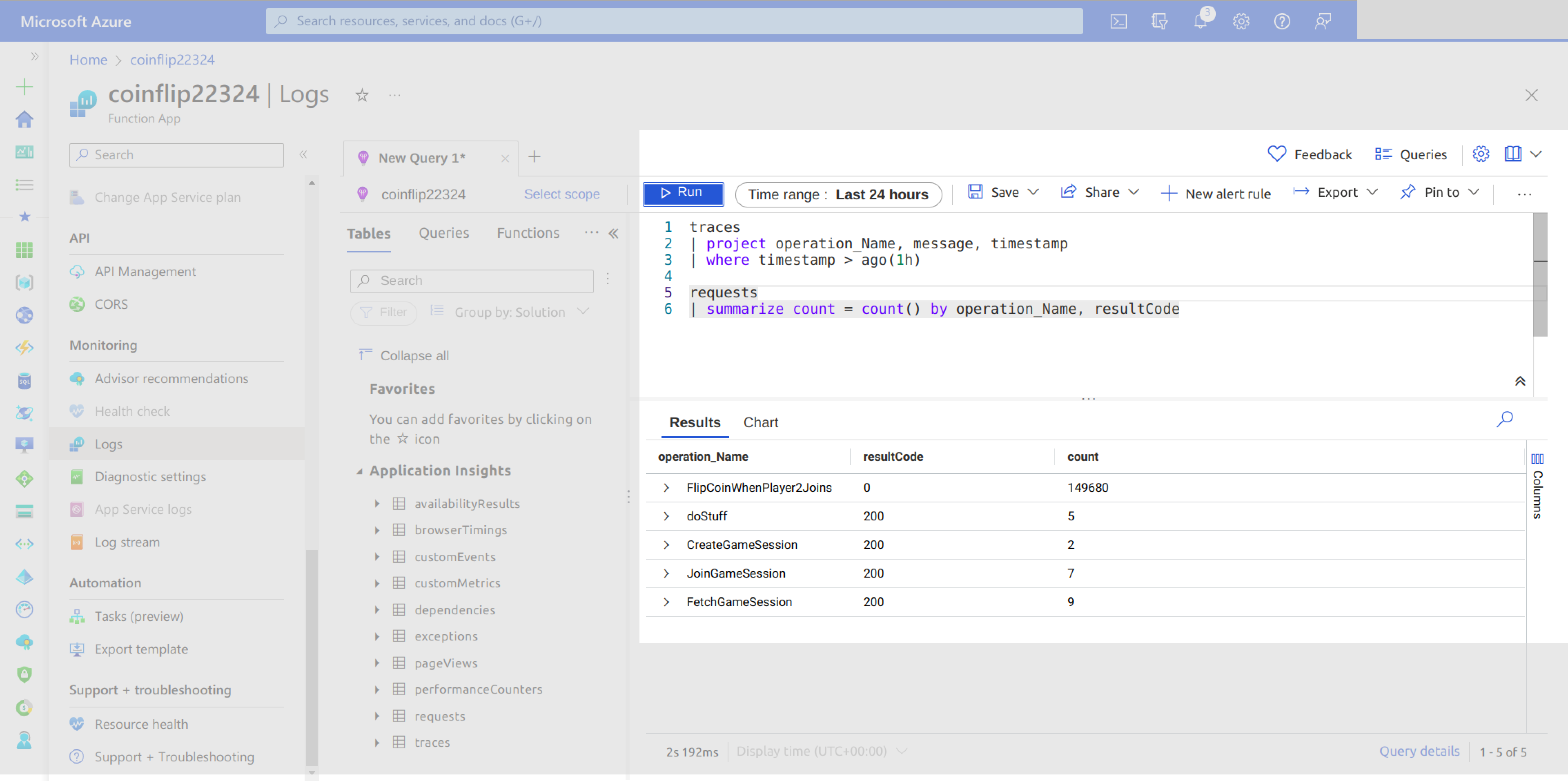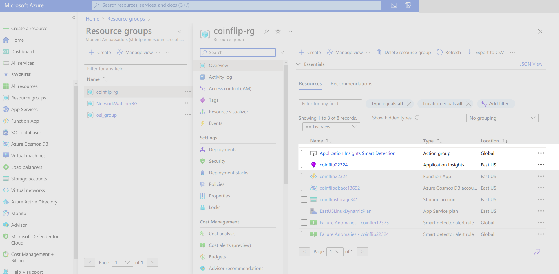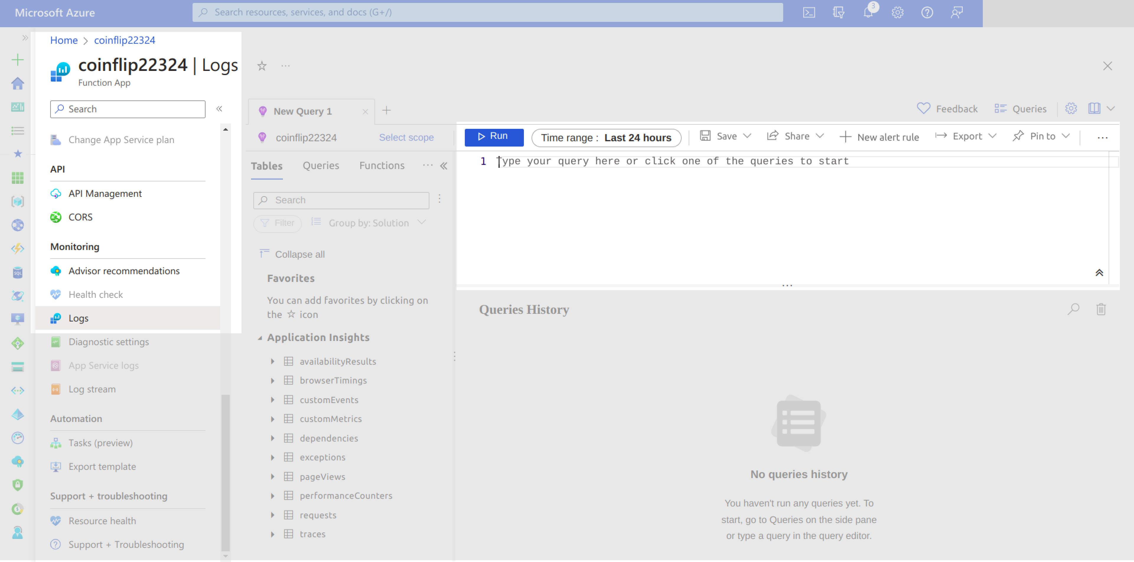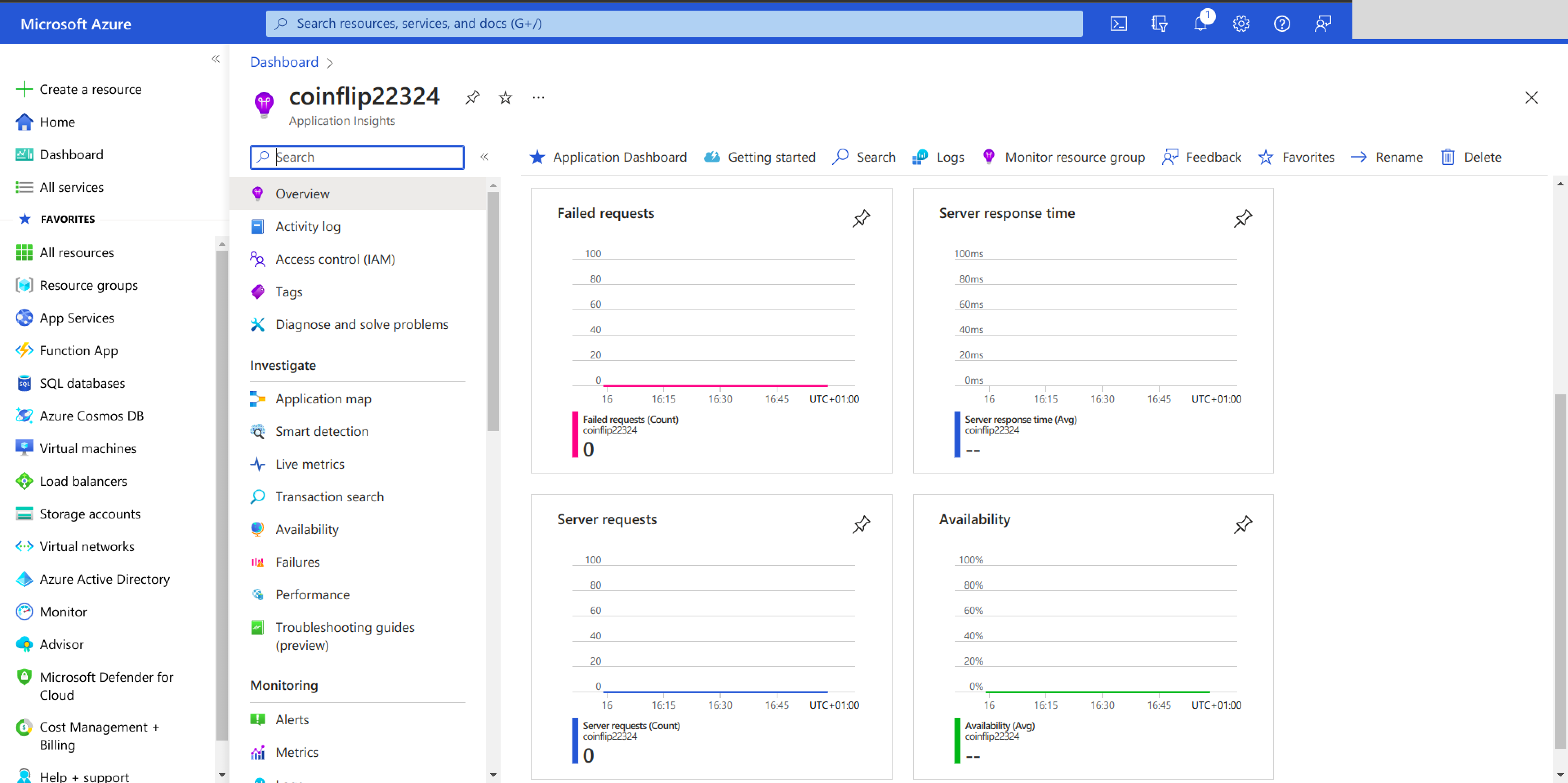 Application Insights is an Azure service for collecting logs and plotting charts based on these logs. You can find your application insights under your coinflip-rg resource group on the Azure portal: