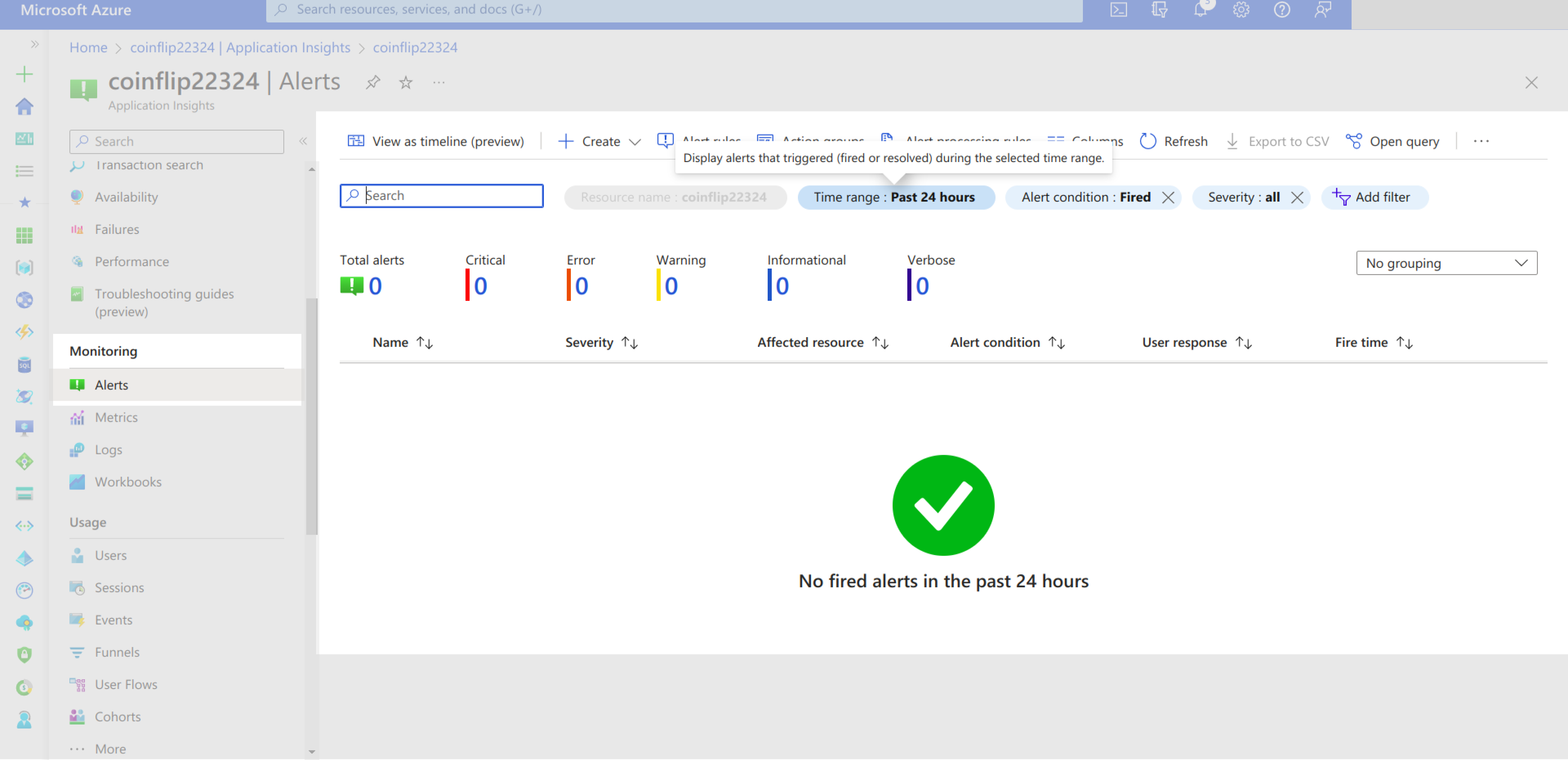 Apart from browsing through logs and metrics on the Application Insights pages, you can set up alerts to notify you when a service is getting out of control. You can access the Alerts page under the Monitoring section of your application insights resource: