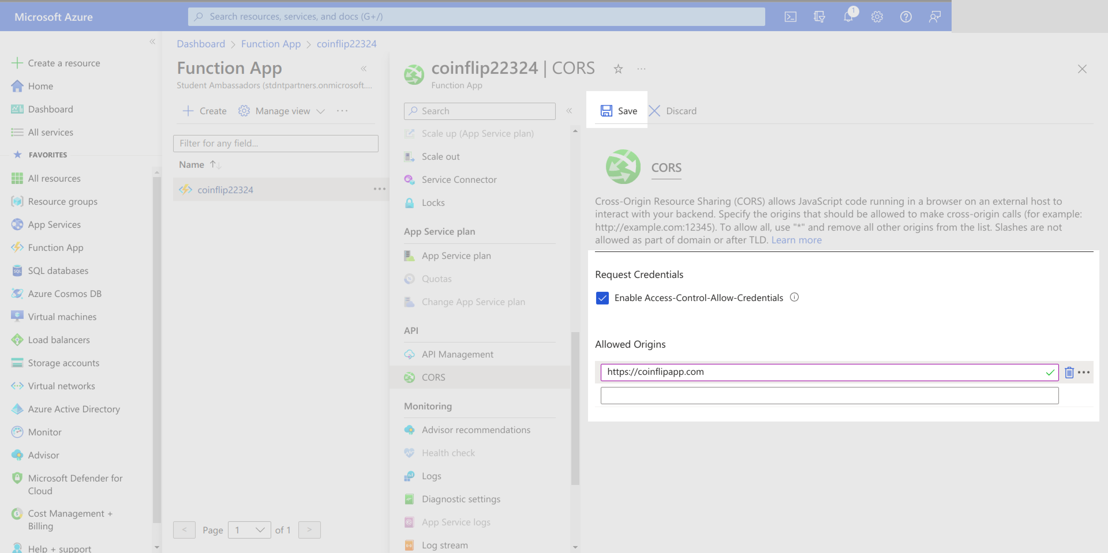 On the CORS page, check the Enable Access-Control-Allow-Credentials option. Add the domains you want to limit your application function to, then click Save: