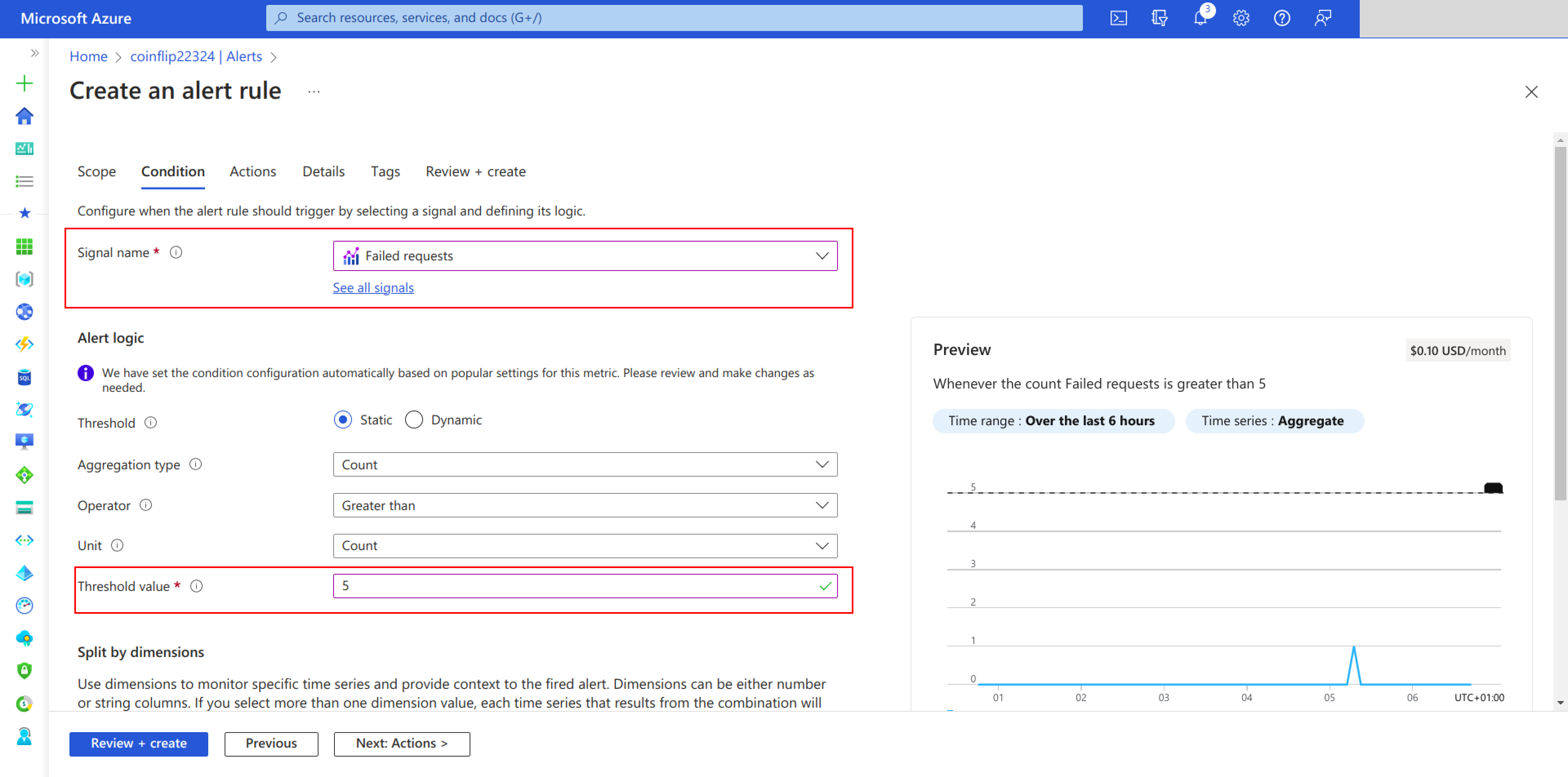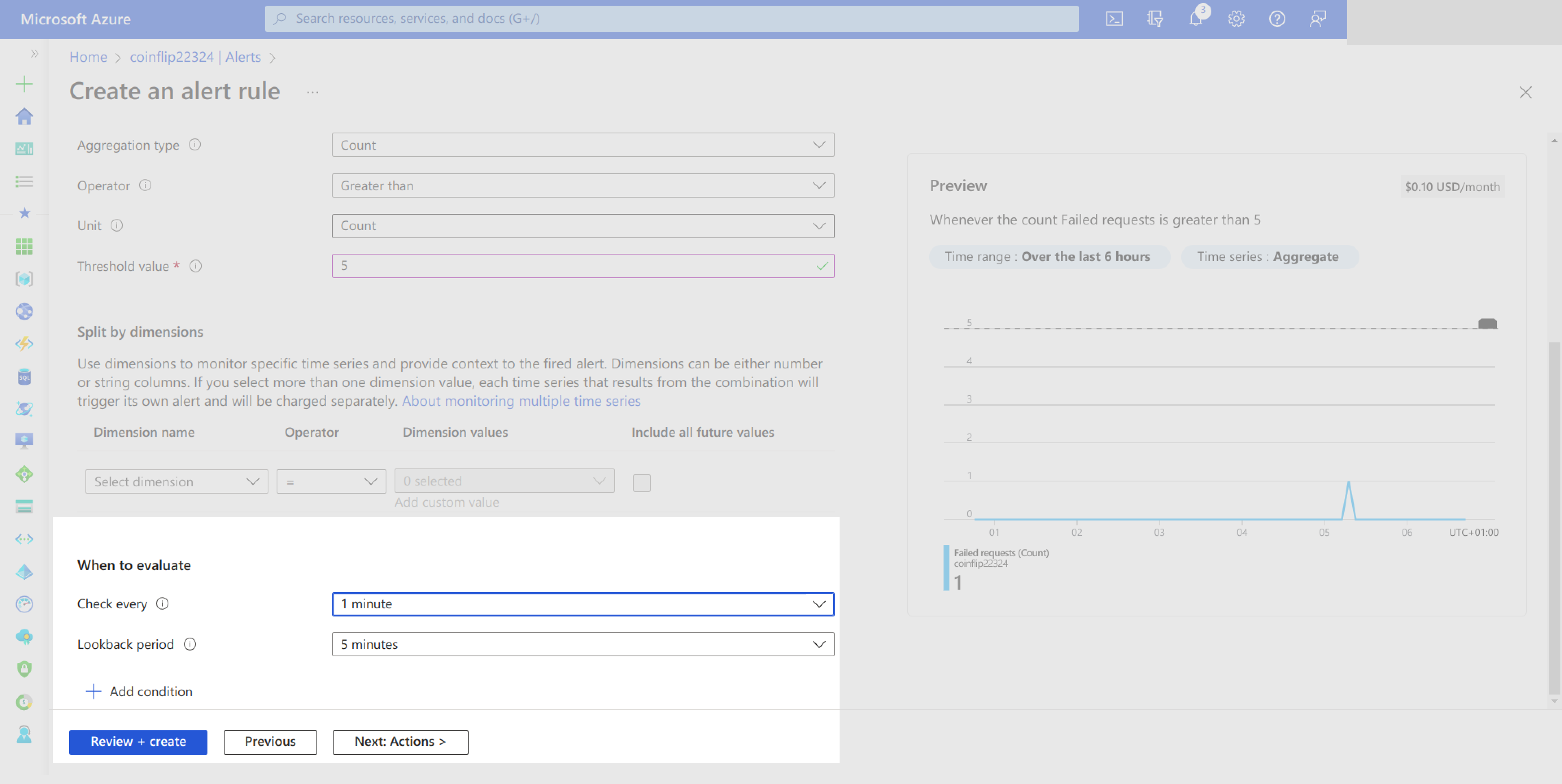 On the Create Alert Rule page, you can set up an alert rule for failed requests. This alert can be set to be triggered when there are more than five failed requests in the timeframe of the alert check: