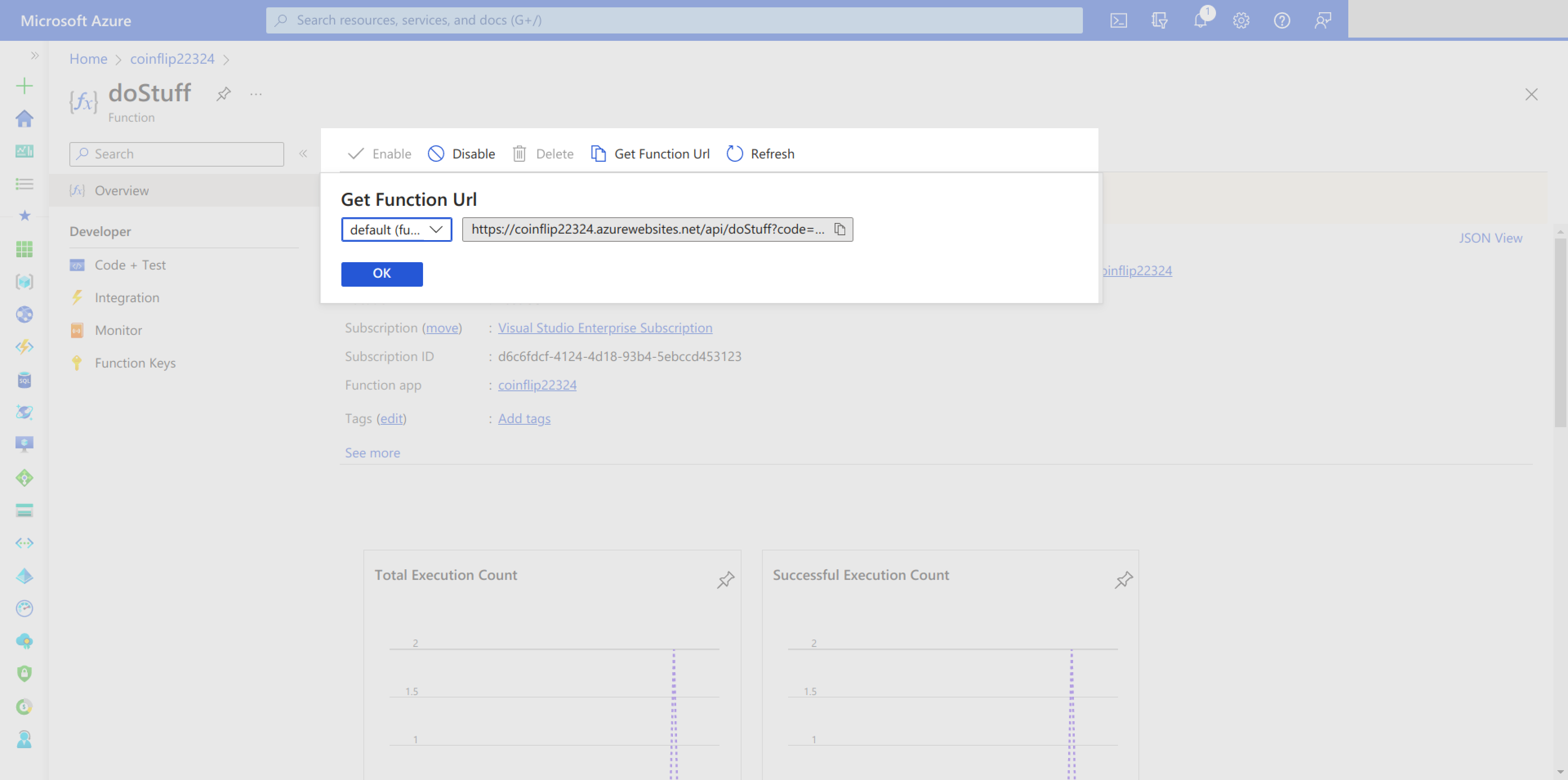});Function keys authentication is not enforced when serving functions using the core tools. It’s only enforced when the function is deployed to Azure. If you go to your Azure portal and copy the functions URL, the code should be copied alongside it: