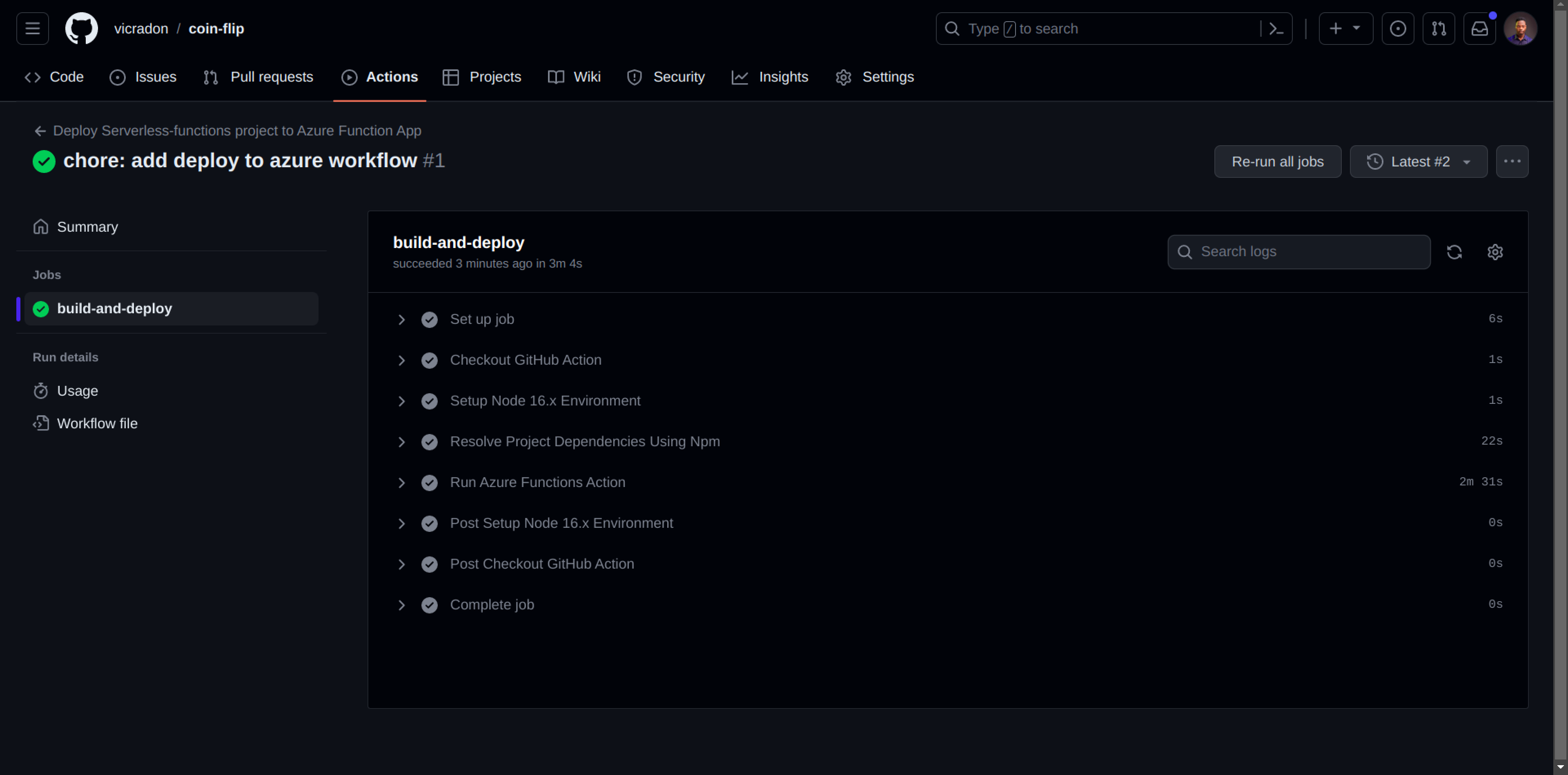 --resource-group coinflip-rgNow, commit the new workflow file and push it to GitHub. The function app is redeployed anytime you push to GitHub. On successful deployment, you should have the following screen on your GitHub Actions page: