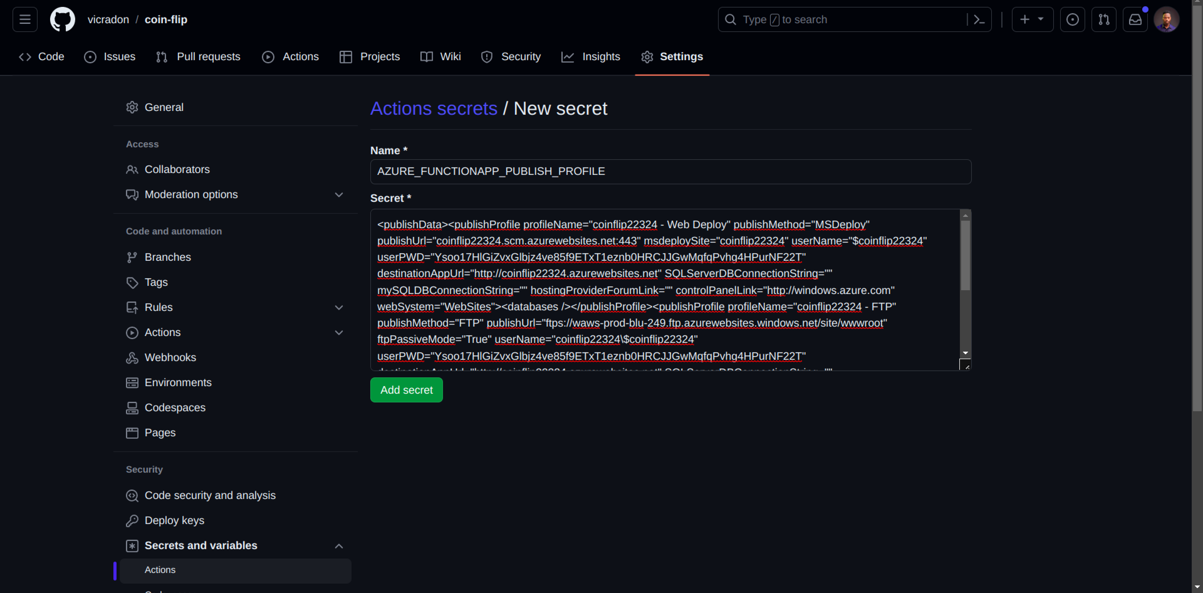 Ensure you replace <YOUR_USERNAME> and <YOUR_REPOSITORY_NAME> with your actual details. On this same page, paste the XML obtained from the most recent command and select Add Secret: