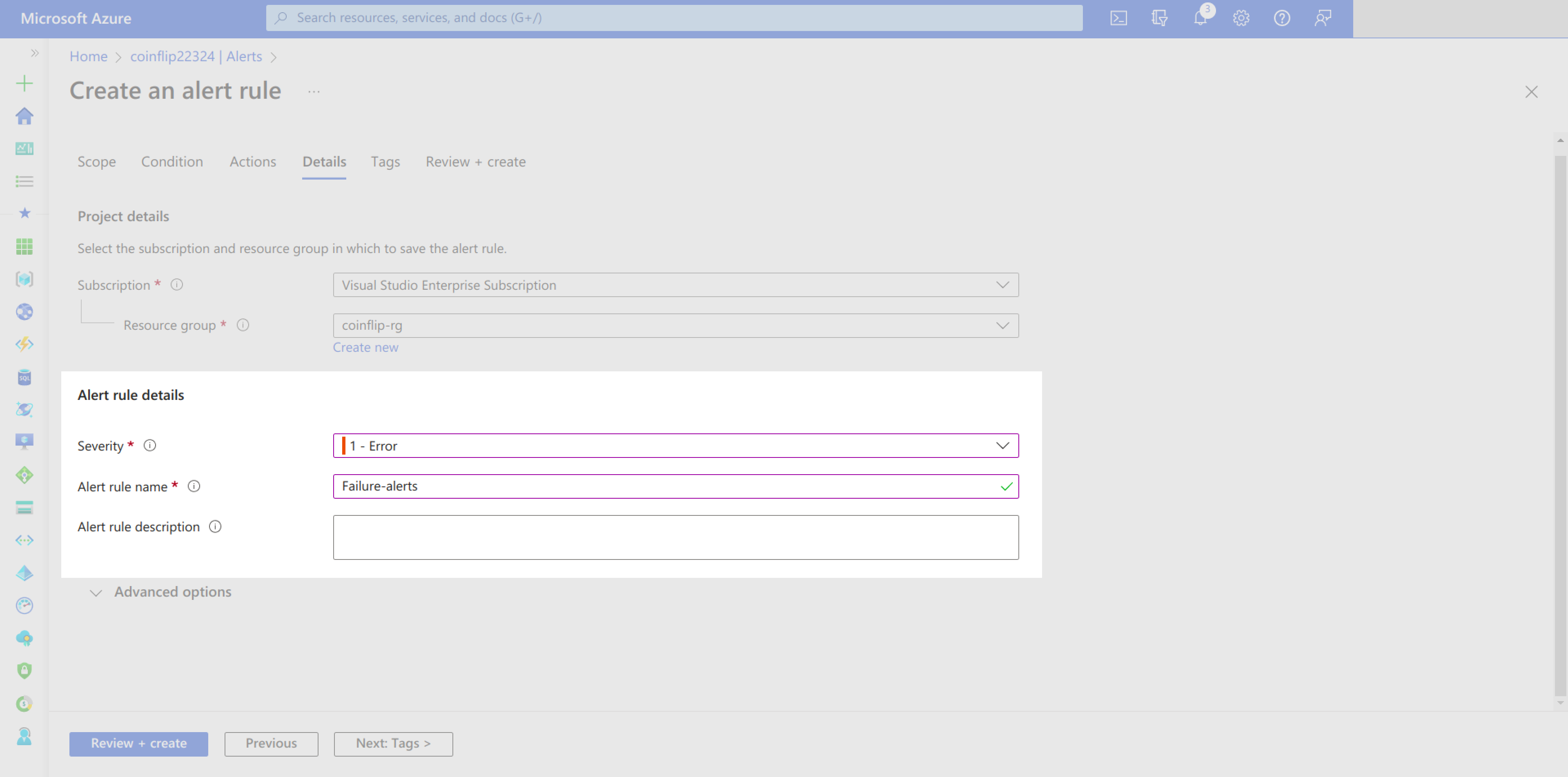 On the Details page of the alerts rule creation flow, you should set the name and the severity of this new alert. The severity does not have to be Error, but it’s better when the alert severity and the type of alert severity (ie failure) both match: