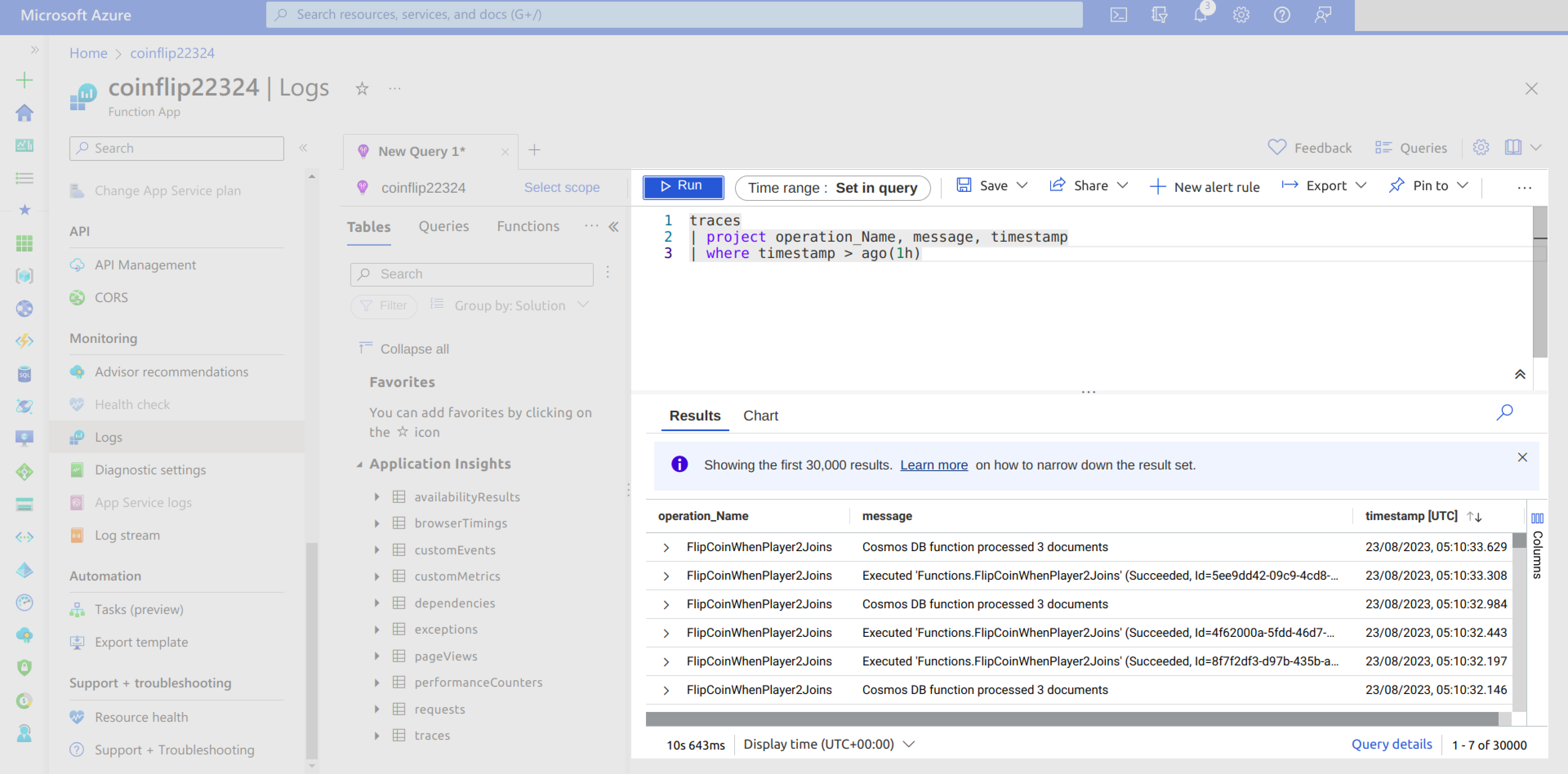 The Logs page opens up with a new query screen that allows you to add a new query. You can fetch the function name, the associating message, and the log time for the first 30,000 logs using the following query:
