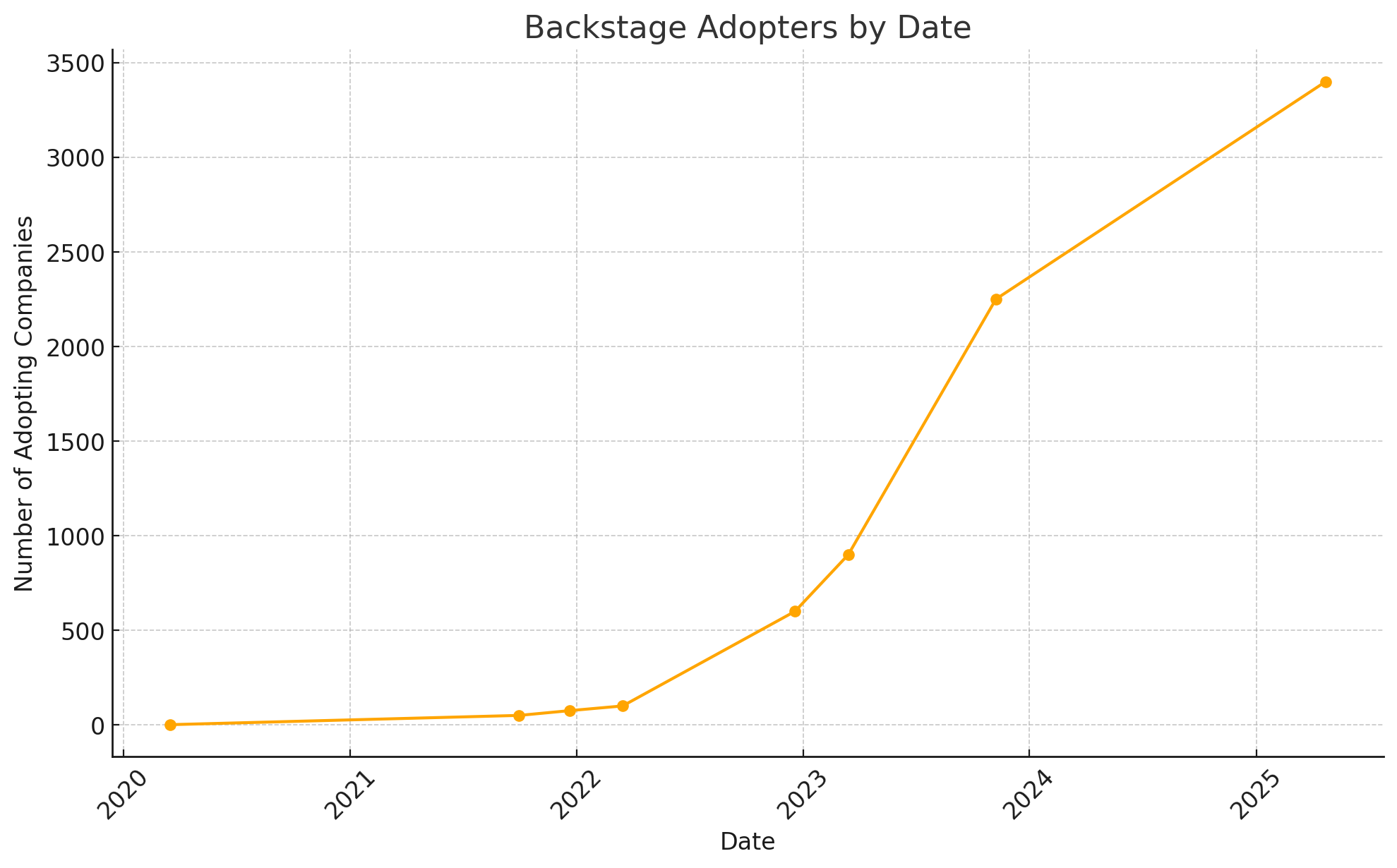 What followed was a massive uptick in adoption. Within just a few years of open-sourcing, some of the largest engineering orgs had adopted Backstage with enthusiasm. Yelp, Twilio, Lyft, Box, VMware, LinkedIn, AirBnB, Epic Games, AWS, Splunk and many others were jumping on the bandwagon.
