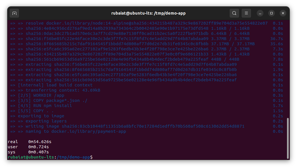 time docker build -t payment-app .Note: If you’re using Docker Desktop and Docker Engine v23.0 and later,