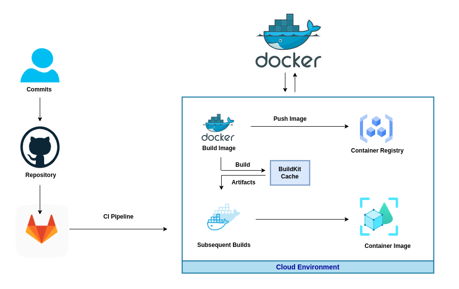 In the following sections, you’ll use BuildKit’s intelligent layer caching system to ramp up the build speed. Here’s a rough architecture diagram showing the implemented solution’s flow: