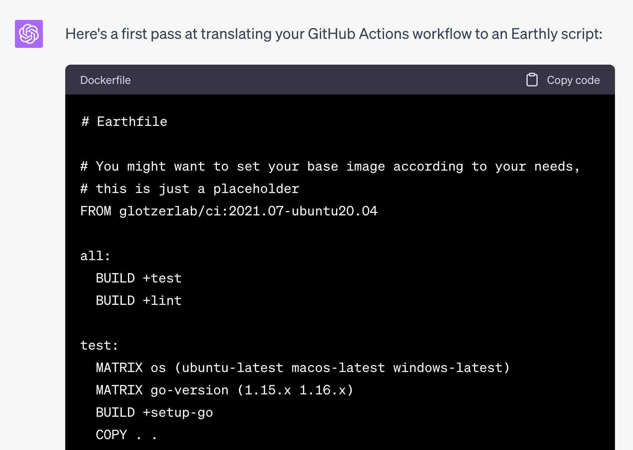 GPT-4 needs to learn more about the Earthfile format to translate it independently. Right now – without any outside information – it will just hallucinate some parts of the Earthfile syntax.
