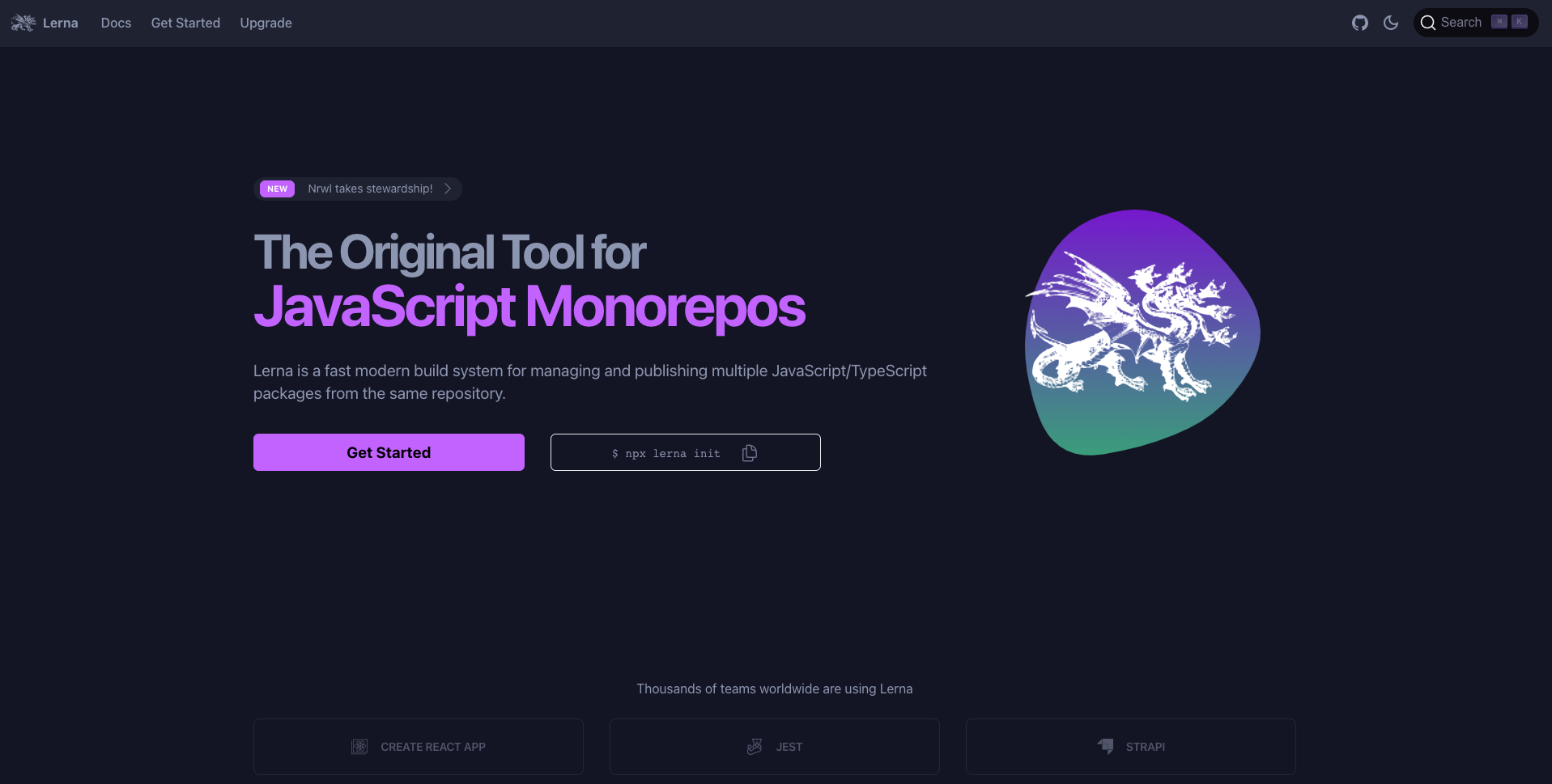 Lerna is a monorepo tool for TypeScript/JavaScript. It allows you to create multiple packages in a single repository. Lerna v5+ can use Nx (an open source build system) to run tasks, which is super fast. Like Lage, Lerna runs npm scripts and uses JavaScript. Some Lerna users include top libraries and frameworks such react-router, Jest, and Babel.