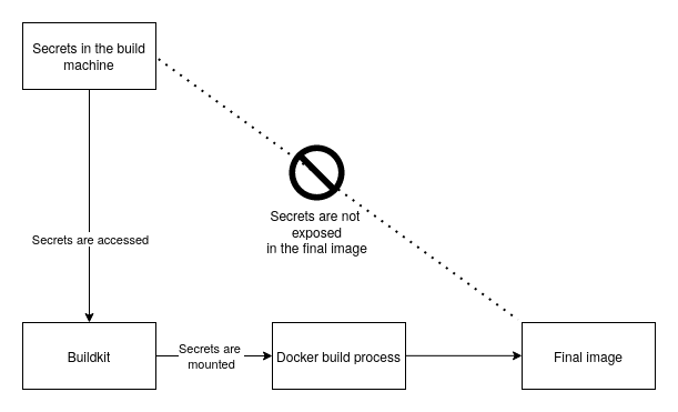 In this scenario, you need to implement a secure solution, which you can do using BuildKit’s secrets handling feature. The following is a workflow diagram using BuildKit to handle secrets: