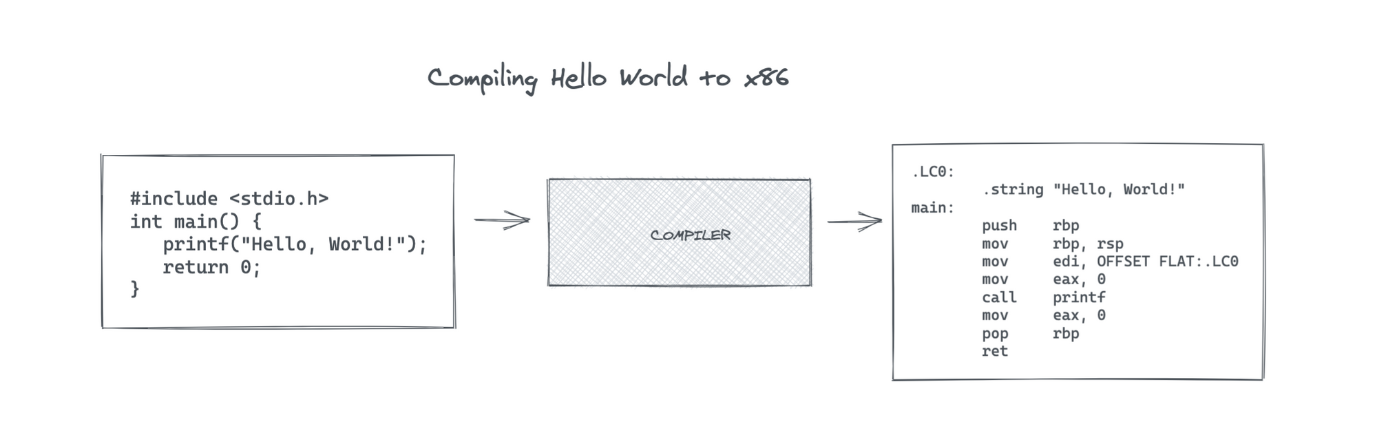 The earlier diagram of compiling “Hello, World” in a single step missed a vital detail. Computer hardware is not a singular thing. If every compiler were a hand-coded mapping from a high-level language to x86 machine code, then moving to the Apple M1 processor would be quite challenging because it has a different instruction set.