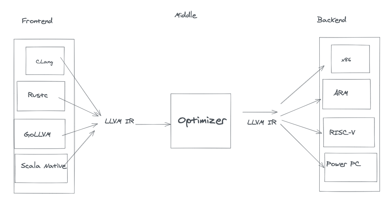 This staged approach means you don’t need a new compiler for each new machine architecture. Instead, you just need a new backend. Here is an example of what that looks like in LLVM: