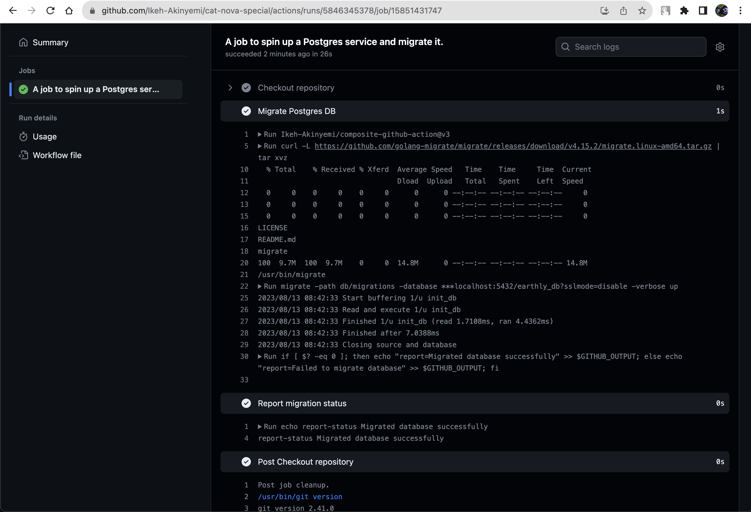 steps: ... - id: postgres-migration name: Migrate Postgres DB uses: Ikeh-Akinyemi/composite-github-action@v1 with: database_url: 'postgres://root:c16bc0af8840ef353a2a51e06b9ef568@localhost:5432/earthly_db?sslmode=disable' migration_files_source: 'file://db/migrations'This step invokes the previously defined composite action by referencing it in the workflow. The naming convention for composite actions typically follows the format