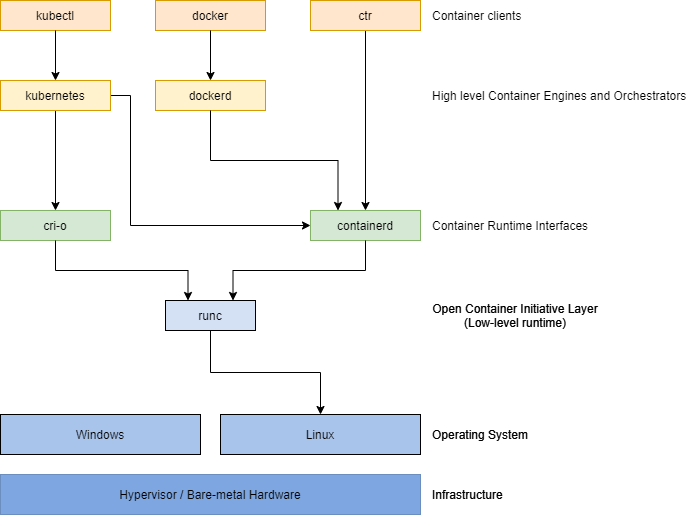 containerd can also use runc’s Windows counterpart, runhcs, to run containers in Windows, or use something like kata to run containers on other platforms.