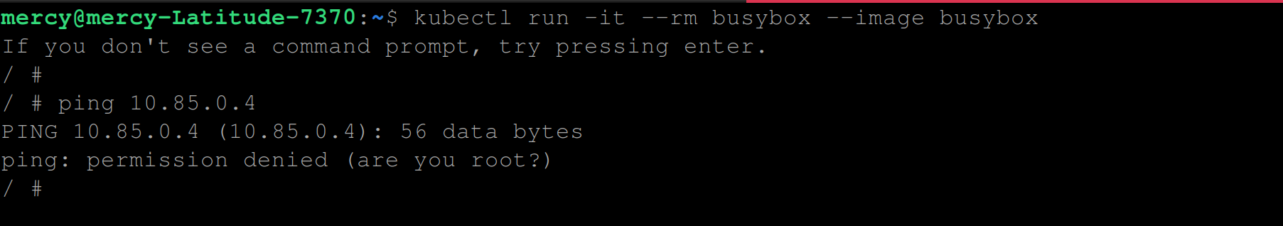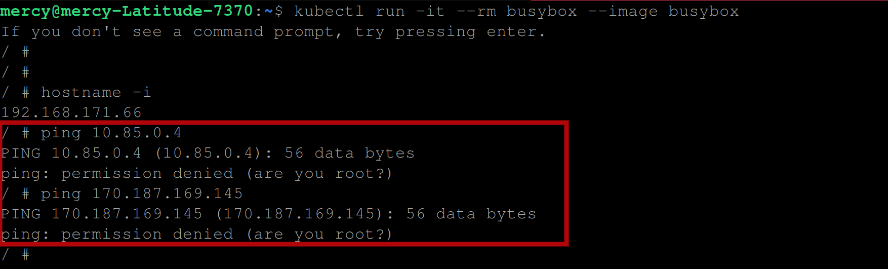 hostname -iExecute the following command to check the network connectivity between the worker node running the busybox container and one of the master node network IP addresses - 10.85.0.4 for instance: