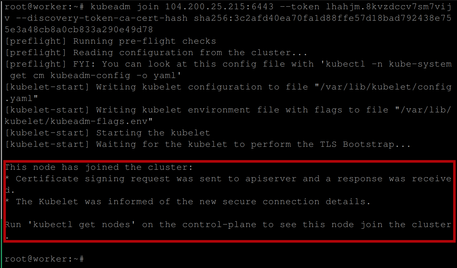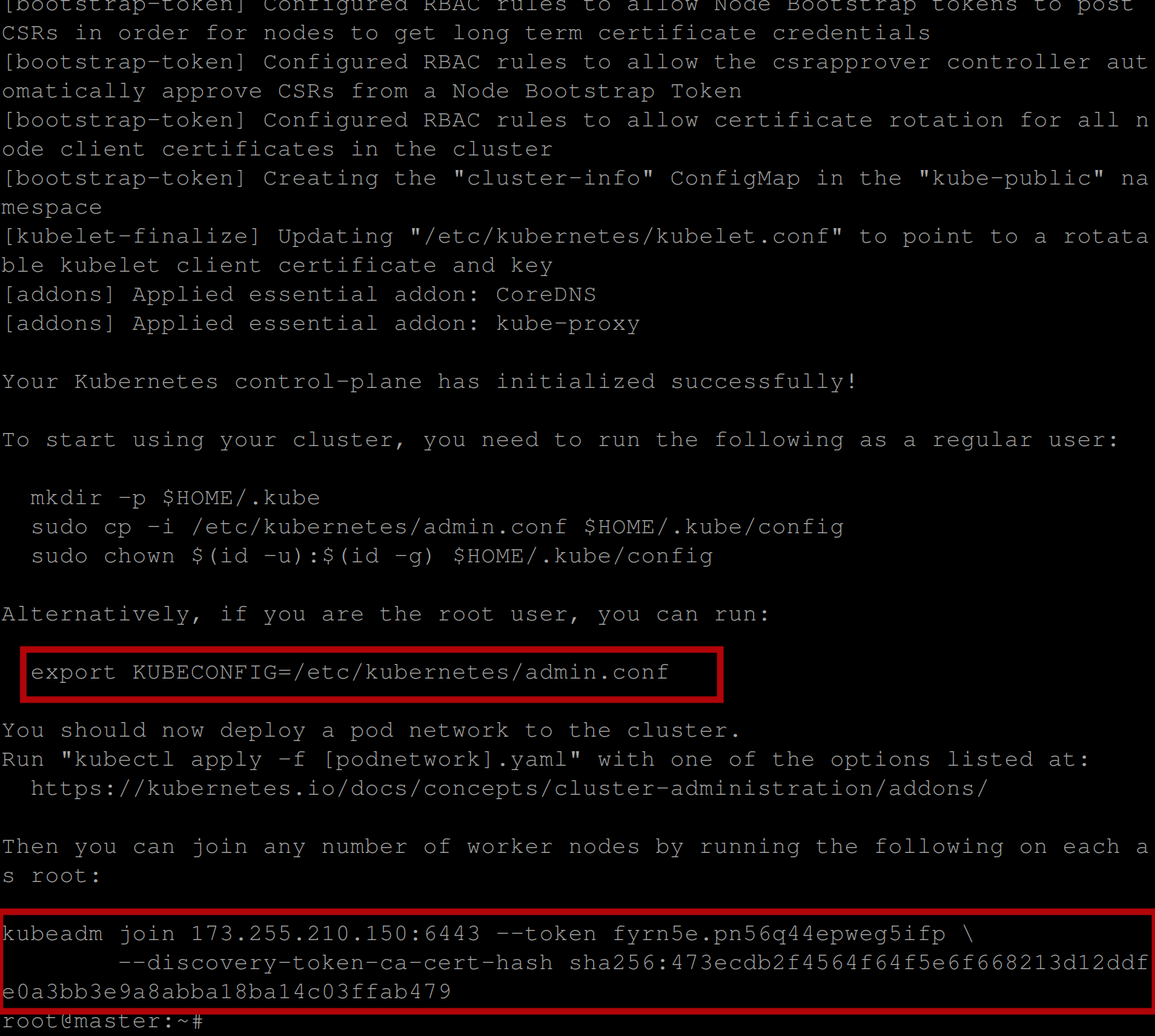 Once the Kubernetes cluster has been initialized successfully, you should have the below output: