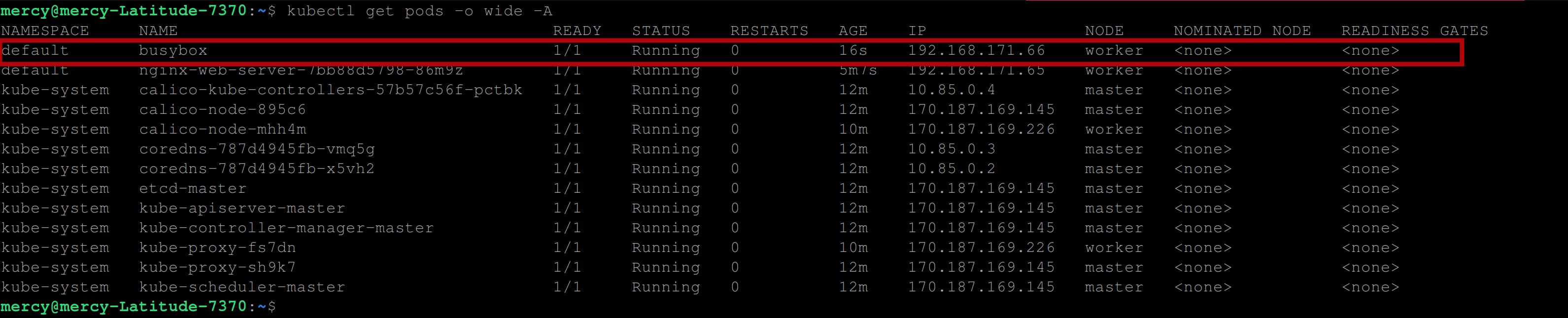 You can see in the image above, that the busybox container is running on the worker node with network IP 192.168.171.66