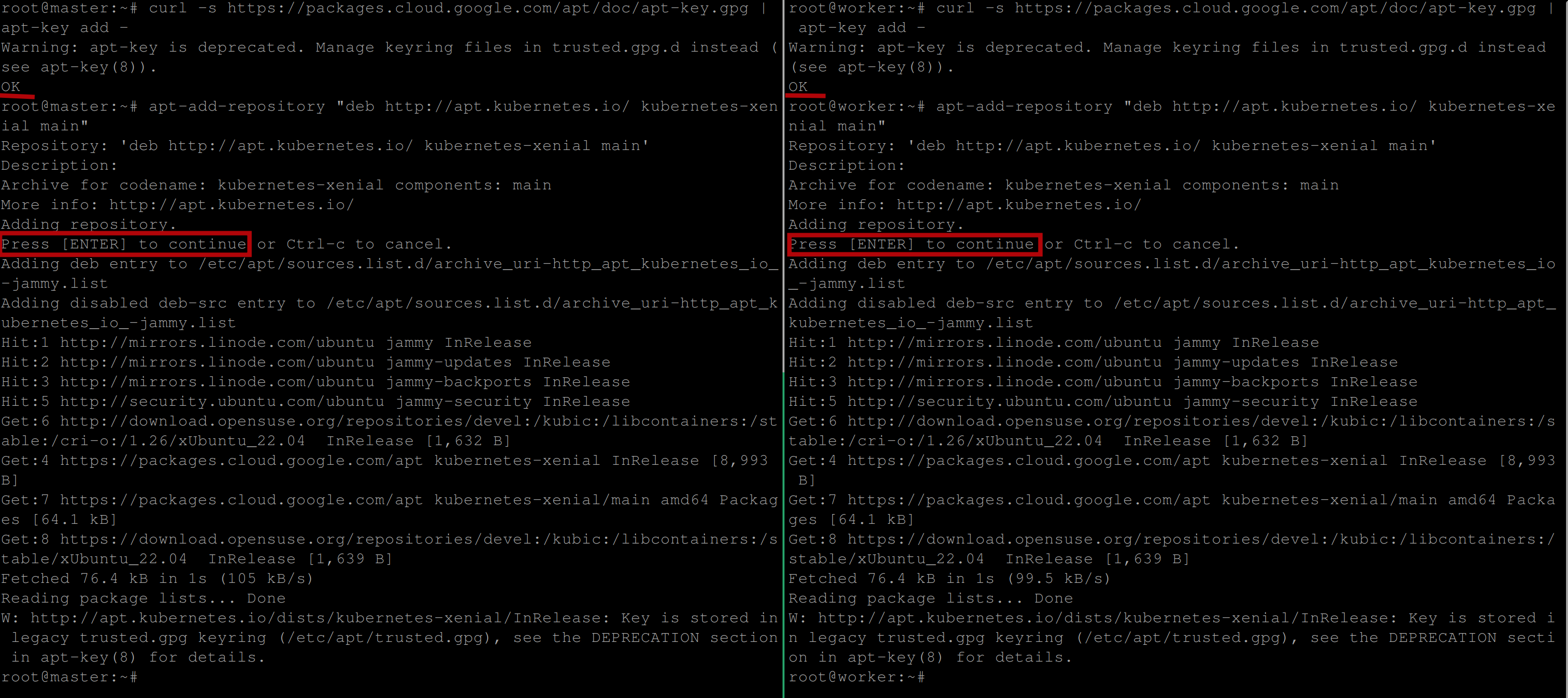 Add the GPG key for the Kubernetes repository, download the Kubernetes repository, and install the Kubernetes components with the following commands: