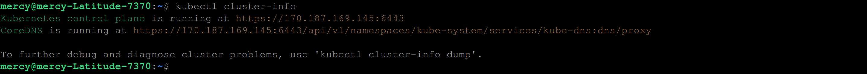 kubectl cluster-infoWhen executed, it displays the URLs for the Kubernetes API server as well as the cluster DNS service IP: