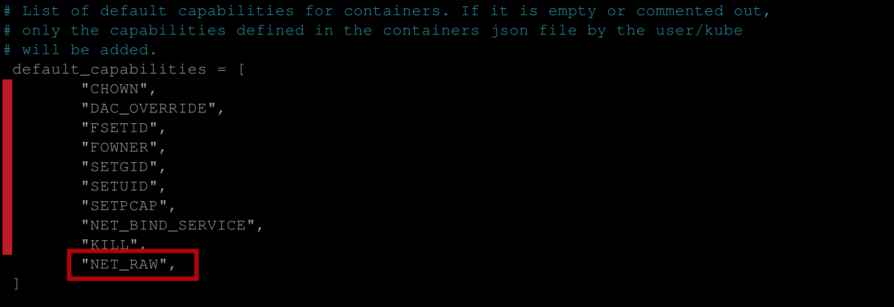 nano /etc/crio/crio.confScroll through the file, stop where you see the lists of capabilities and add the NET_RAW capability in the list as shown below, be sure to also uncomment the capabilities by simply deleting the # character before each capability: