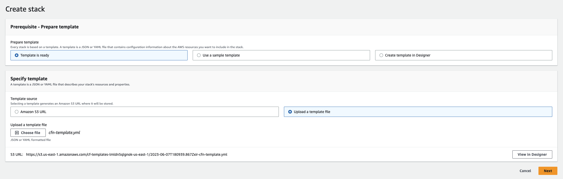Choose Template is ready and Upload a template file; then upload the cfn-template.yml file from the previous section: