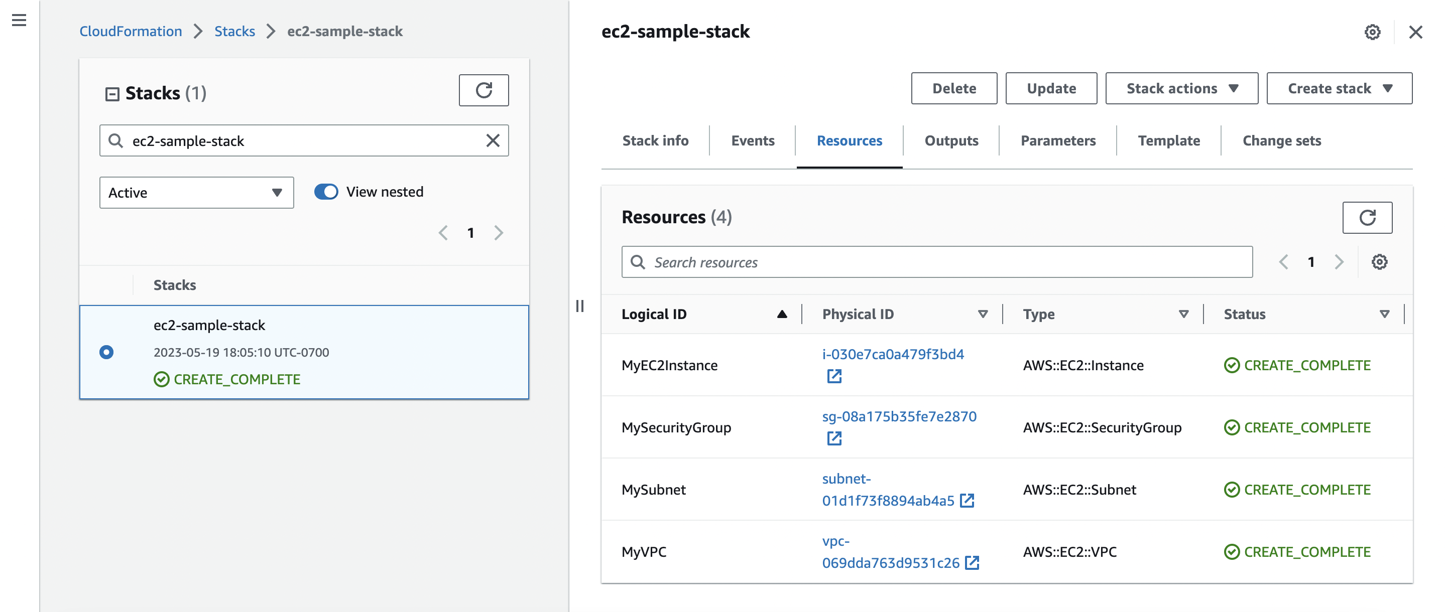 Finally, if you decide that you no longer need your stack, you can simply delete it by choosing Delete. This deletes all resources in the stack unless you enable termination protection settings on it (more on this later).