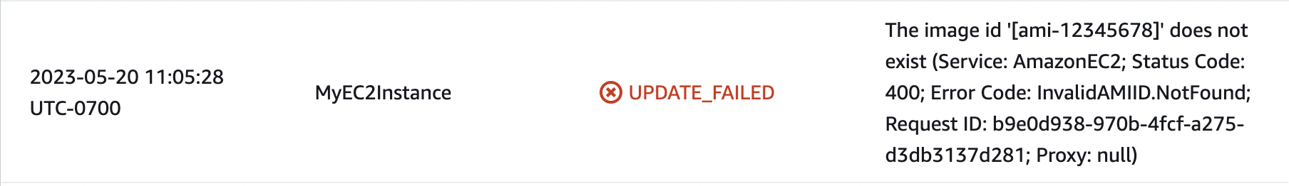 So far, you haven’t run into any hiccups. However, you may encounter a scenario where you provide CloudFormation with invalid configurations, which can cause issues during stack operations. To demonstrate what happens when CloudFormation encounters issues, as well as walk you through a sample update flow, substitute the ImageId: ami-06a0cd9728546d178 property in the template with the following: