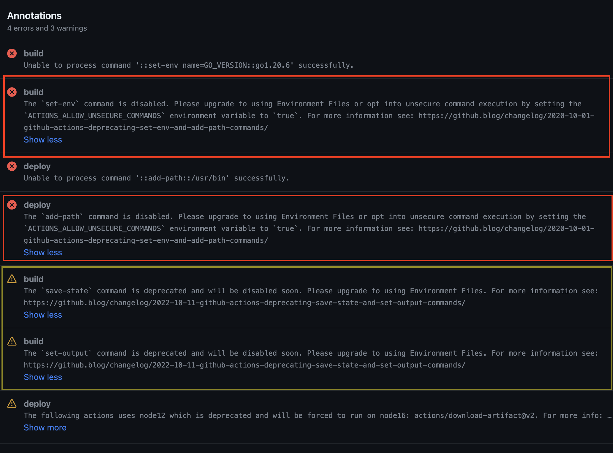 The fixes discussed above are applicable when you get these errors and warnings because you use these commands directly in your workflow files. It is also possible that you get these errors and warnings due to an action that your workflow file depends on.