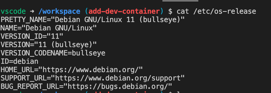 Now you can run cmd + shift + P and type Remote-Containers: Open Folder in Container. Everything will disappear for a minute while the containers are spinning up. Once it’s done you can pull up your terminal and you’re now inside your dev container! All the files in your project should be available in the default directory /workspace.