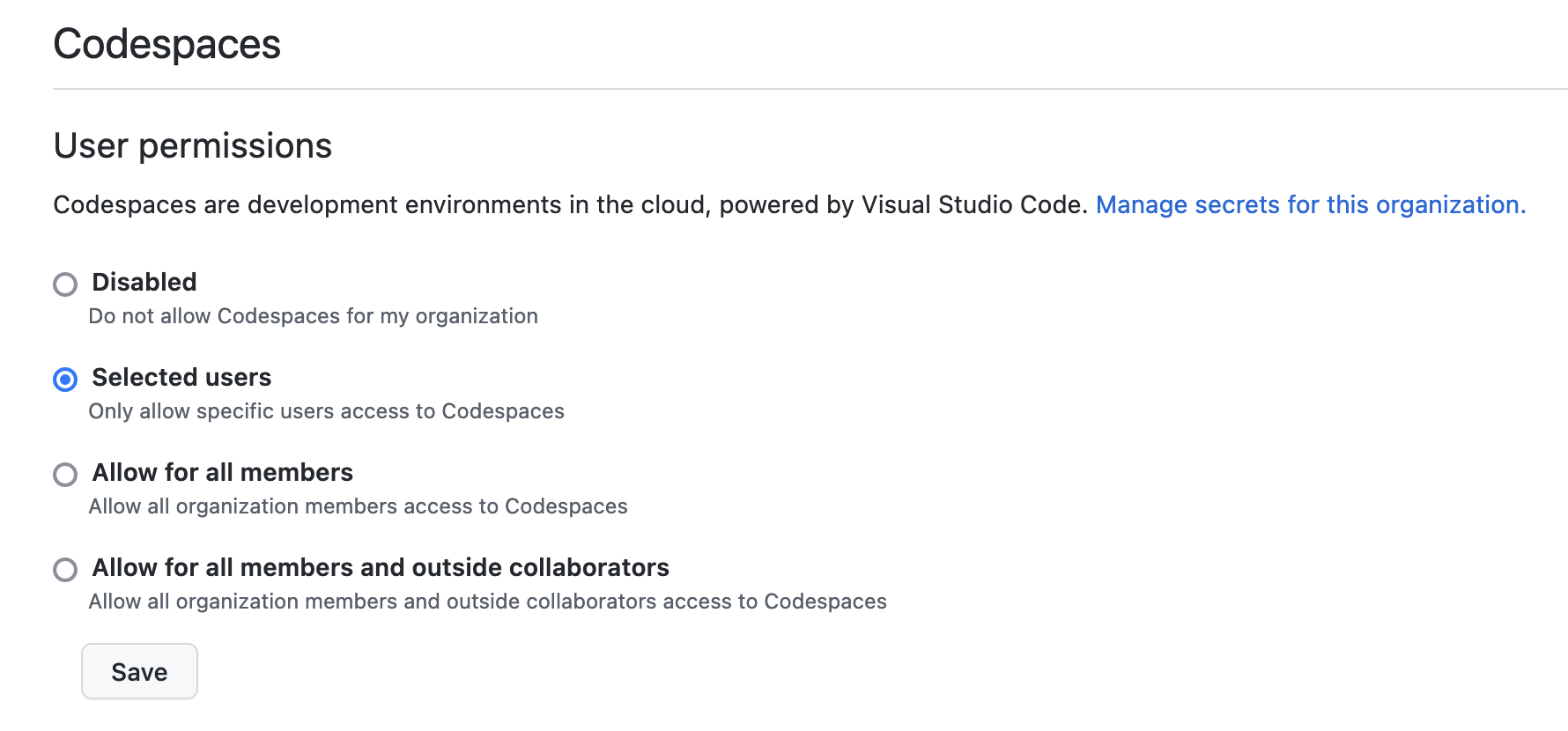 To enable Codespaces for your organization, go to your org’s settings page. On the left, scroll down to Codespaces and click general. Here you can choose to activate Codespaces with a number of options for who can use them. You can turn them on for everyone in your org, select certain members or allow anyone in your org and anyone you invite to a repo as a collaborator to use them. Just make sure whoever has access is trusted as costs for compute time can add up quickly.
